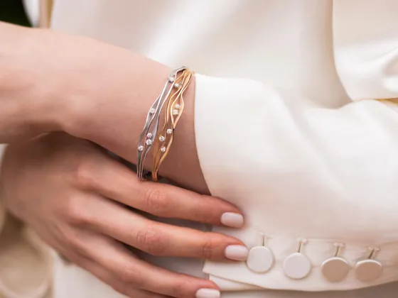 The Dune range reflects the curves of desert dunes, with light splitting diamonds set within waves of gold; soft motion effects that bring the sun, sea and sand together in elegantly crafted pieces such as an 18ct Gold and Diamond Dune Bangle. With its irregular curves, the bangle replicates the dynamism of desert dunes interspersed with precious diamonds. The same summery effect is created by an 18ct Gold and Diamond Assolo Dune Ring, or a beautiful 18ct Gold and Diamond Dune Pendant which has velvety surfaces in the depths with glossy golden highlights.
