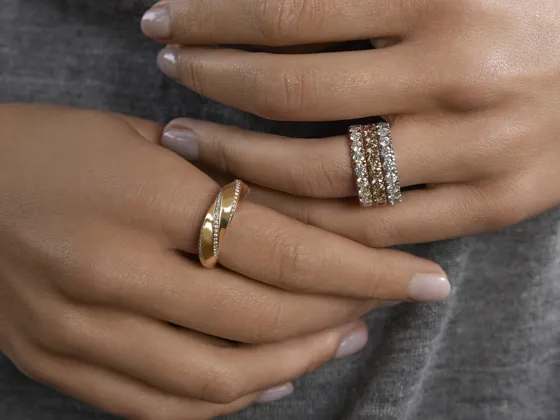 Even if these three colours don’t appeal, some jewellery makers have created a whole new gold palette to choose from. Italian jewellery designer Annamaria Cammilli, for example, offers a range from yellow lemon bamboo gold to black lava gold. Colour is, of course, a personal preference also influenced by factors like skin tone and, if you can’t decide, just mix your metals by stacking your rings or bracelets.