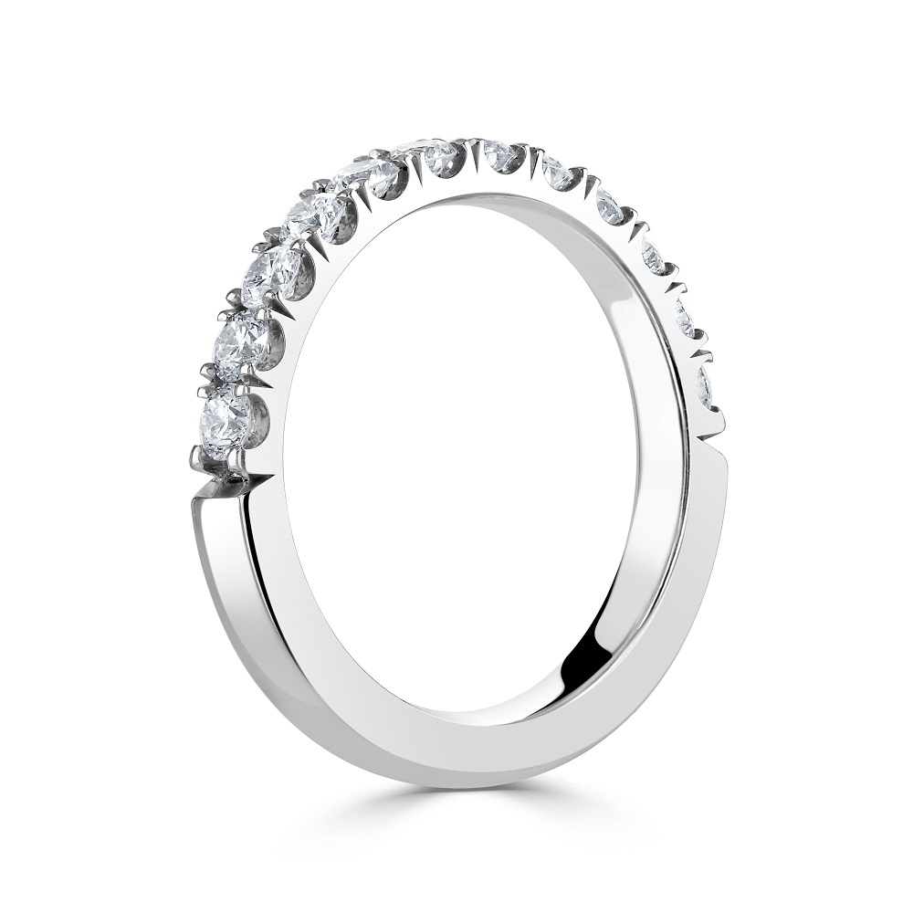 Embrace the timeless elegance of our platinum half eternity ring, exquisitely crafted to symbolize enduring love. This luxurious ring features twelve round brilliant cut diamonds, collectively weighing 0.72 carats, each meticulously set in a four-claw setting for maximum security and brilliance. The platinum band, known for its durability and sleek appearance, enhances the natural sparkle of the diamonds, creating a continuous ribbon of light. Ideal for anniversaries, wedding bands, or as a sophisticated addition to any jewellery collection, this half eternity ring blends classic design with contemporary appeal, ensuring it remains a beloved piece for years to come.