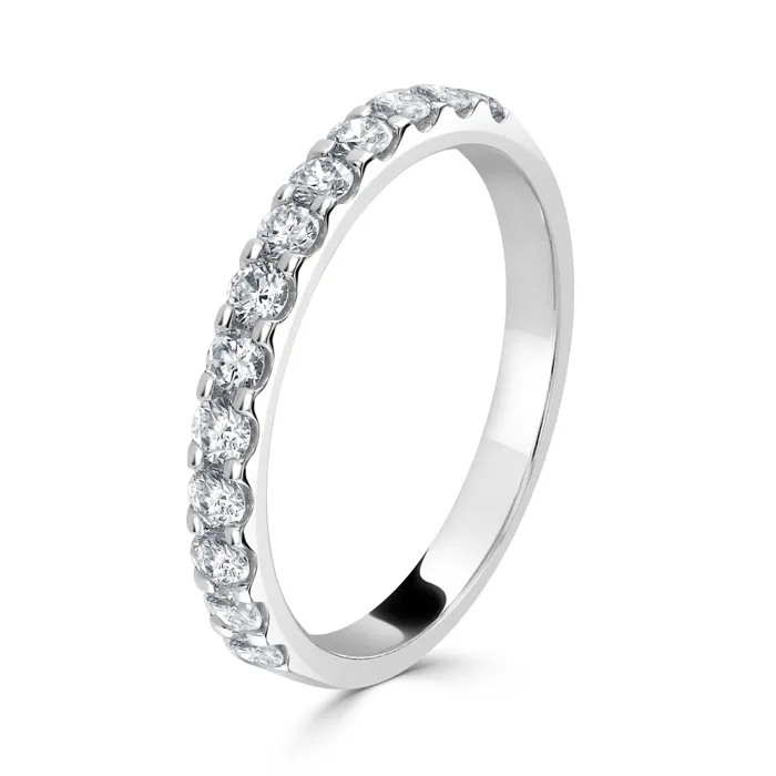 A classically elegant platinum half eternity ring, a luxurious addition to any fine jewellery collection. This exquisite ring is adorned with 13 round brilliant cut diamonds, claw-set to perfection across the band. Each diamond has been carefully selected to provide a total weight of 0.50 carats, offering a brilliant display of sparkle and clarity that captures the light with every movement. Crafted in durable and sleek platinum, this ring combines the enduring qualities of one of the most precious metals with the timeless beauty of diamonds. Ideal for an anniversary gift, wedding band, or a special celebration, this half eternity ring is designed to symbolize everlasting love and is sure to be treasured for generations.