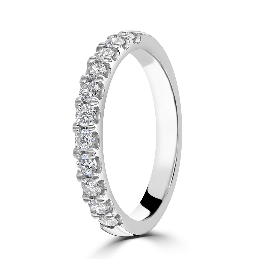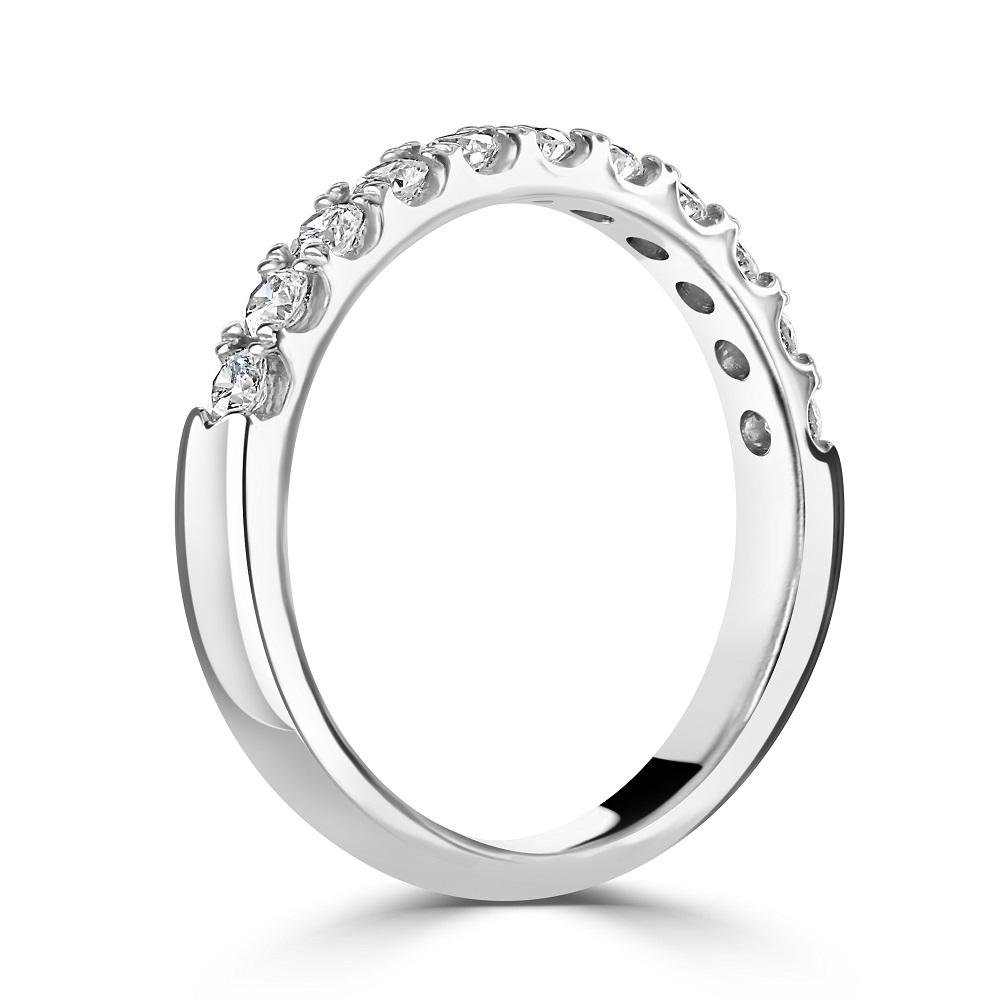 Celebrate timeless elegance with this platinum half eternity ring, expertly crafted for lasting beauty and sophistication. Featuring 15 round brilliant-cut diamonds in a classic castle claw setting, this design maximizes light exposure for exceptional sparkle and brilliance. With a total diamond weight of approximately 0.60ct, each stone is hand-selected for quality and radiance, making this ring an ideal choice for a wedding band, anniversary gift, or a luxurious stacking piece. The strength and purity of platinum ensure durability and a sleek, modern finish that complements any style.