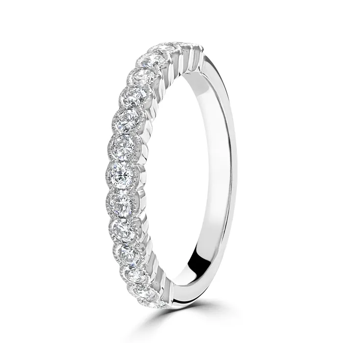 Introducing our platinum half eternity ring, a masterful blend of traditional elegance and modern design. This luxurious ring is adorned with fifteen round brilliant cut diamonds, totalling 0.50 carats, each securely set in a sophisticated rubover setting. The milgrain detailing around each diamond adds a touch of vintage charm and enhances the overall sparkle. Crafted from durable and sleek platinum, this ring is designed to last a lifetime while maintaining its lustrous appeal. Perfect for an anniversary gift, wedding band, or a stylish everyday accessory, this half eternity ring is a symbol of eternal love and timeless style, sure to be cherished for generations to come.