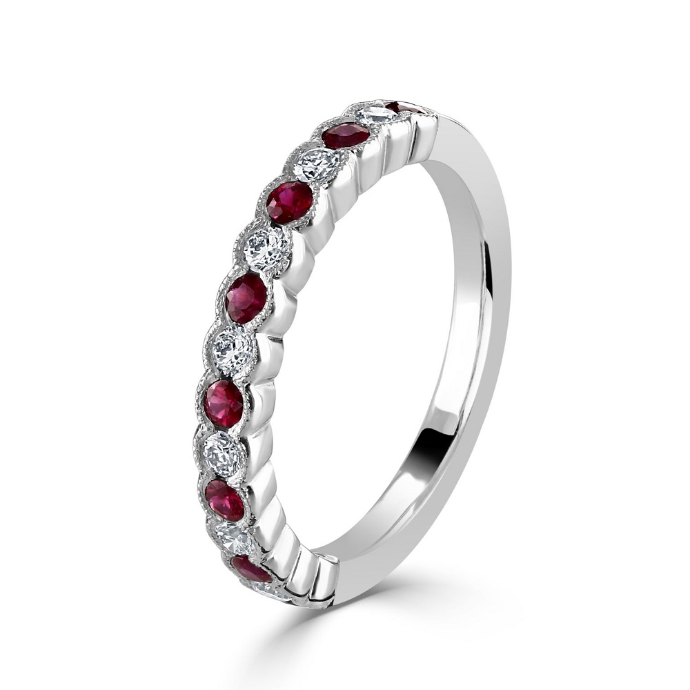 A stunning platinum half eternity ring, an exquisite piece of fine jewellery that combines elegance with a touch of vintage charm. This ring features an alternating sequence of eight round rubies and seven round brilliant-cut diamonds, all set in a secure rubover setting with delicate milgrain detailing. The rubies, with a total weight of 0.31 carats, offer a vibrant splash of colour, while the diamonds, totalling 0.22 carats, add a continuous sparkle that enhances the overall design. Crafted from premium platinum, known for its durability and sleek finish, this ring is perfect for everyday wear or as a special gift to commemorate a meaningful occasion. Ideal for those who appreciate the beauty of gemstones paired with the sophistication of intricate details, this half eternity ring is a timeless choice that promises to captivate.