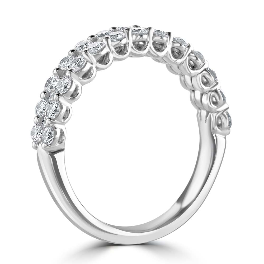 Immerse yourself in the timeless beauty of our platinum half eternity ring, meticulously crafted to feature two stunning rows of claw-set round brilliant cut diamonds. This sophisticated design showcases a total of 26 diamonds, each carefully selected for its brilliance and clarity. With a combined diamond weight of 0.97 carats, this ring ensures a dazzling sparkle that captures and reflects light beautifully, making it an eye-catching addition to any jewellery collection. Ideal for celebrating life's most cherished moments, this platinum half eternity ring is perfect for anniversaries, milestone celebrations, or simply as a token of everlasting love. The dual rows of diamonds offer a luxurious and striking appearance, while the secure claw settings provide both elegance and durability. The high-quality platinum band enhances the radiance of the diamonds, creating a harmonious blend of strength and beauty. This exquisite ring is not just a piece of jewellery; it's a symbol of enduring love and commitment. The exceptional craftsmanship and attention to detail ensure that this ring will be a treasured heirloom, passed down through generations. Its classic yet contemporary design makes it versatile, suitable for both everyday wear and special occasions.