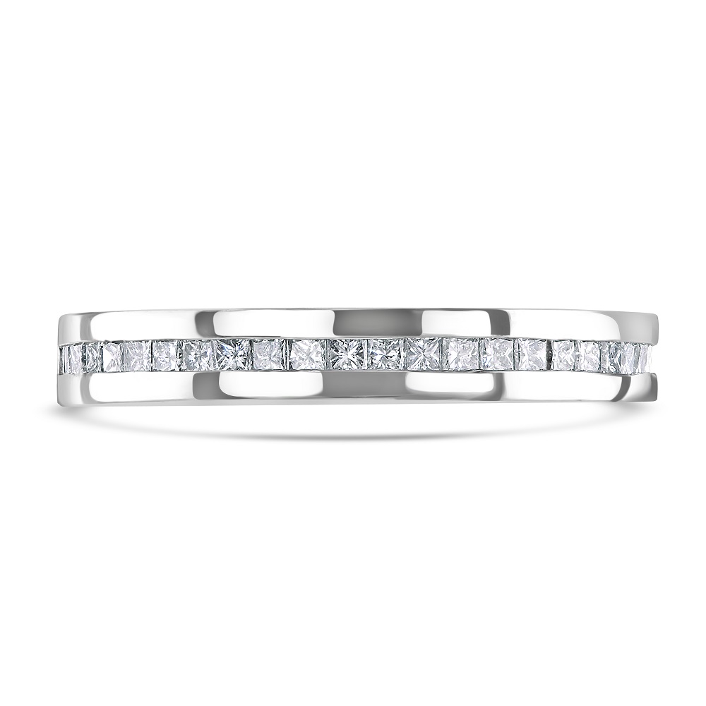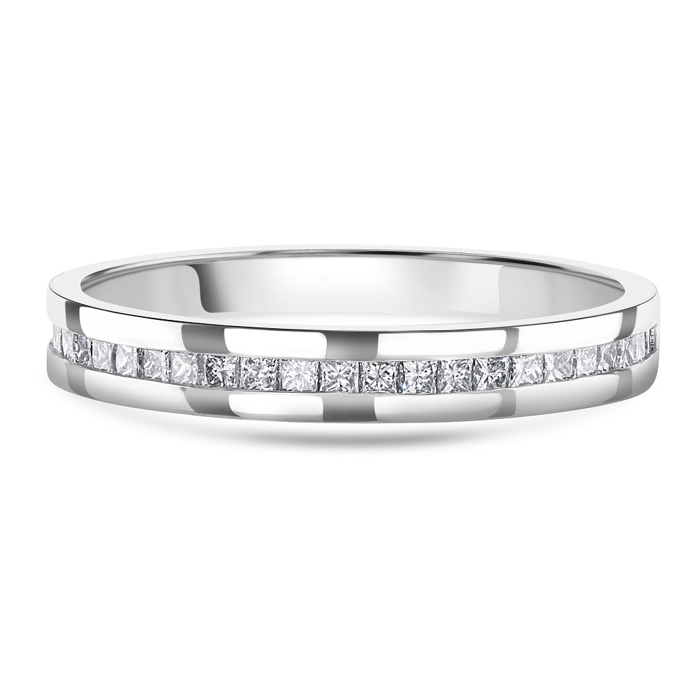 The ring features a modern 3.0mm flat court shape, providing a sleek and comfortable fit. It is channel set with shimmering princess cut diamonds, which are known for their sharp angles and beautiful brilliance. The diamonds, totalling 0.66 carats, are perfectly aligned in a secure channel that not only protects each stone but also enhances their visual impact with a continuous sparkle.