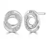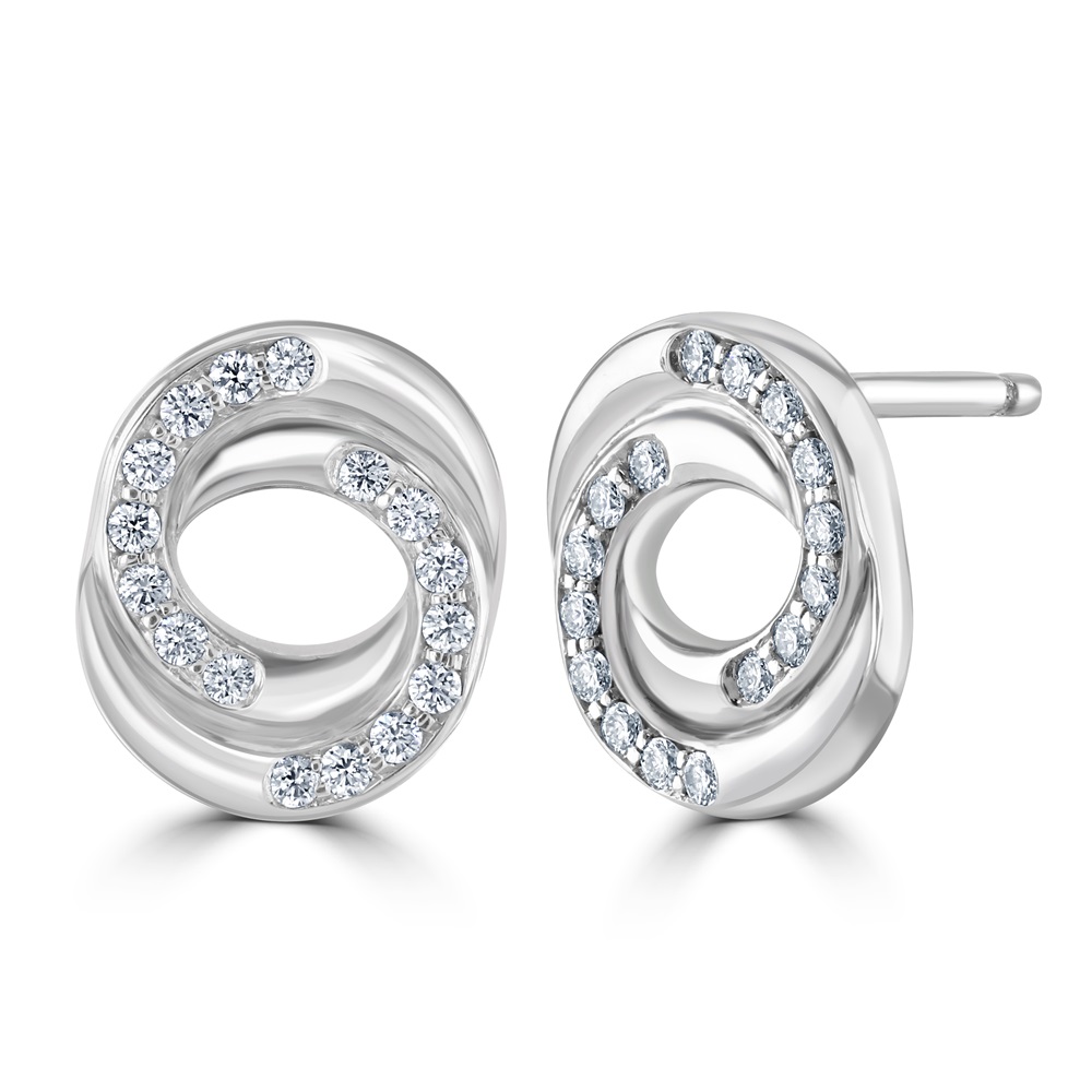 Our platinum stud earrings feature an exquisite design of two entwined circles, each half micro claw-set with round brilliant cut diamonds. This captivating pair showcases a total diamond weight of 0.12ct, emphasizing subtle sparkle and intricate craftsmanship.