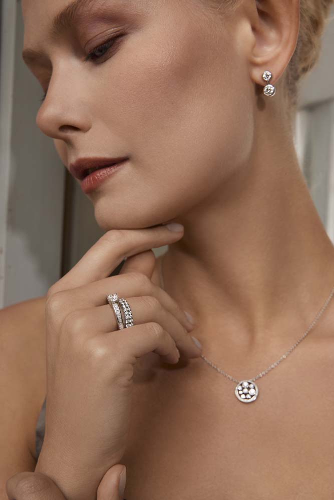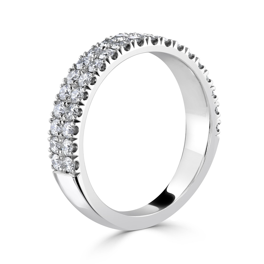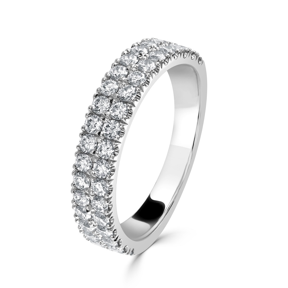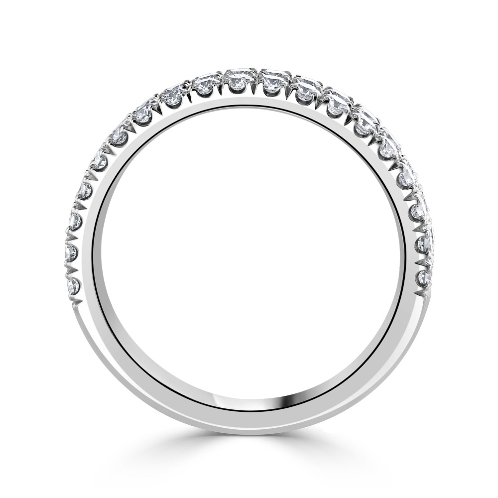 Enhance your collection with our platinum half eternity ring, beautifully crafted to symbolize everlasting elegance. This luxurious ring features two rows of 19 round brilliant cut diamonds each, totalling 38 diamonds with a combined weight of 0.84 carats. Each diamond is expertly set in a four-claw castle setting, which not only secures the stones but also elevates them to maximize light exposure and enhance their natural brilliance. Crafted from premium platinum, known for its strength and polished finish, this ring embodies a timeless design that’s perfect for celebrating life’s most significant moments. Whether as an anniversary band, a wedding ring, or a sophisticated addition to any jewellery collection, this half eternity ring offers a blend of durability, style, and luxury that will be treasured for generations.