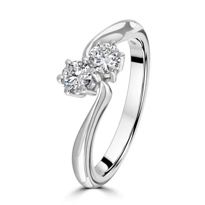 Elevate your style with this elegant platinum diamond crossover ring, a contemporary design that exudes sophistication. Featuring two round brilliant-cut diamonds, each secured in a refined six-claw setting, this piece offers a harmonious balance of brilliance and modern artistry. With a total diamond weight of 0.43 carats, this ring is perfect for those seeking a luxury diamond ring that combines timeless craftsmanship with a unique twist. The crossover design symbolizes unity and connection, making it an ideal choice for an anniversary ring, right-hand ring, or a distinctive engagement ring alternative.