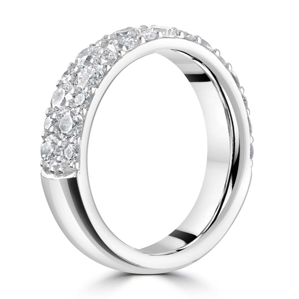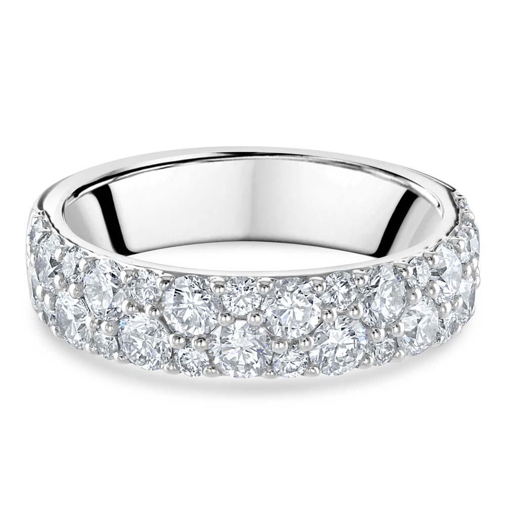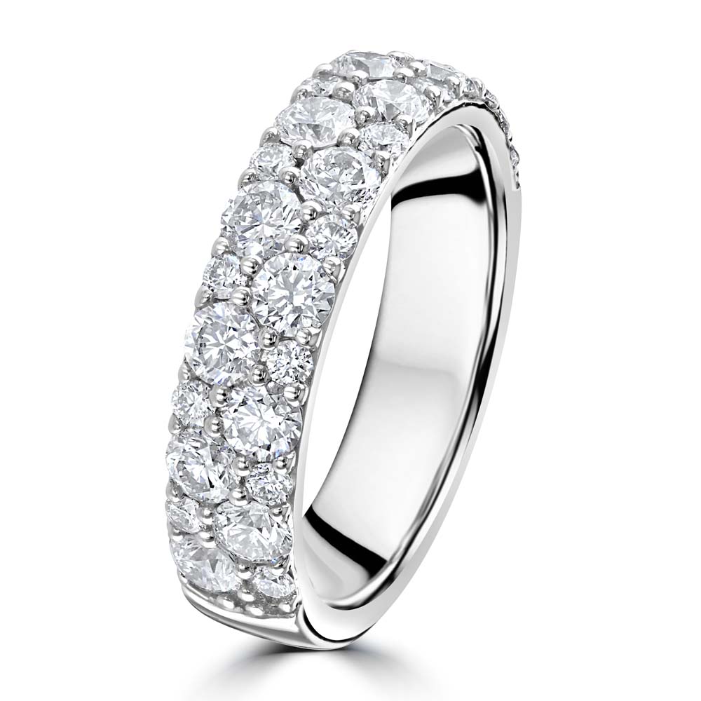 A dazzling display of craftsmanship and brilliance, this exquisite half eternity ring is crafted in platinum and pavé set with two rows of alternating large and small round brilliant-cut diamonds. The design creates a captivating rhythm of sparkle and texture, offering a bold yet elegant statement. With a total diamond weight of 1.50 carats for the larger stones and 0.30 carats for the smaller, this ring delivers exceptional fire and radiance from every angle. Perfect as a celebration of enduring love or a luxurious addition to any fine jewellery collection.