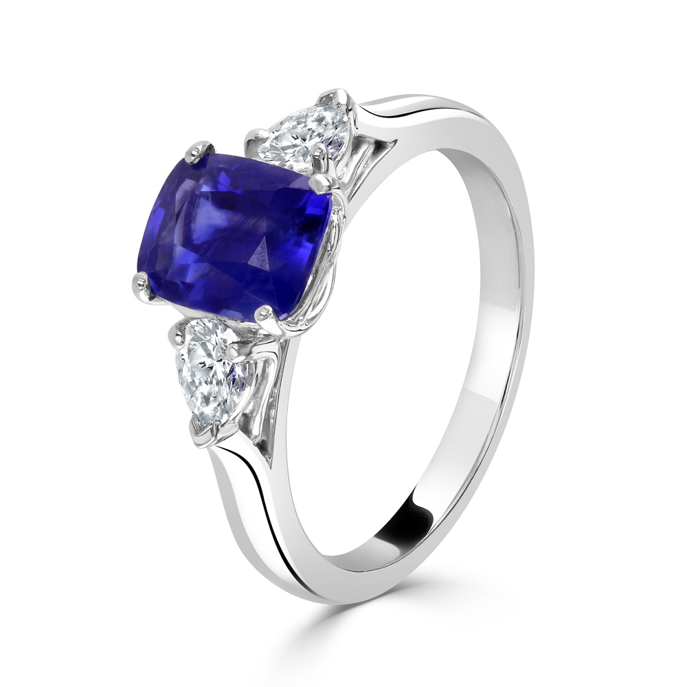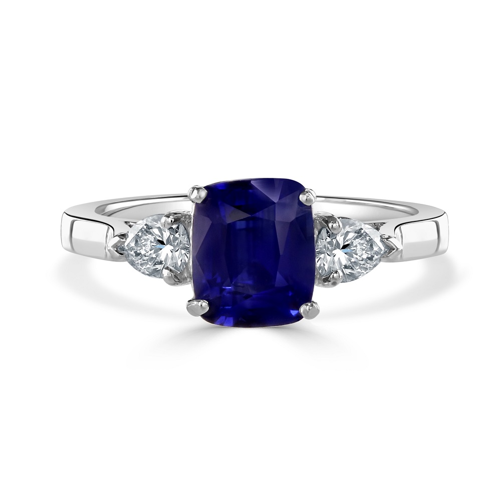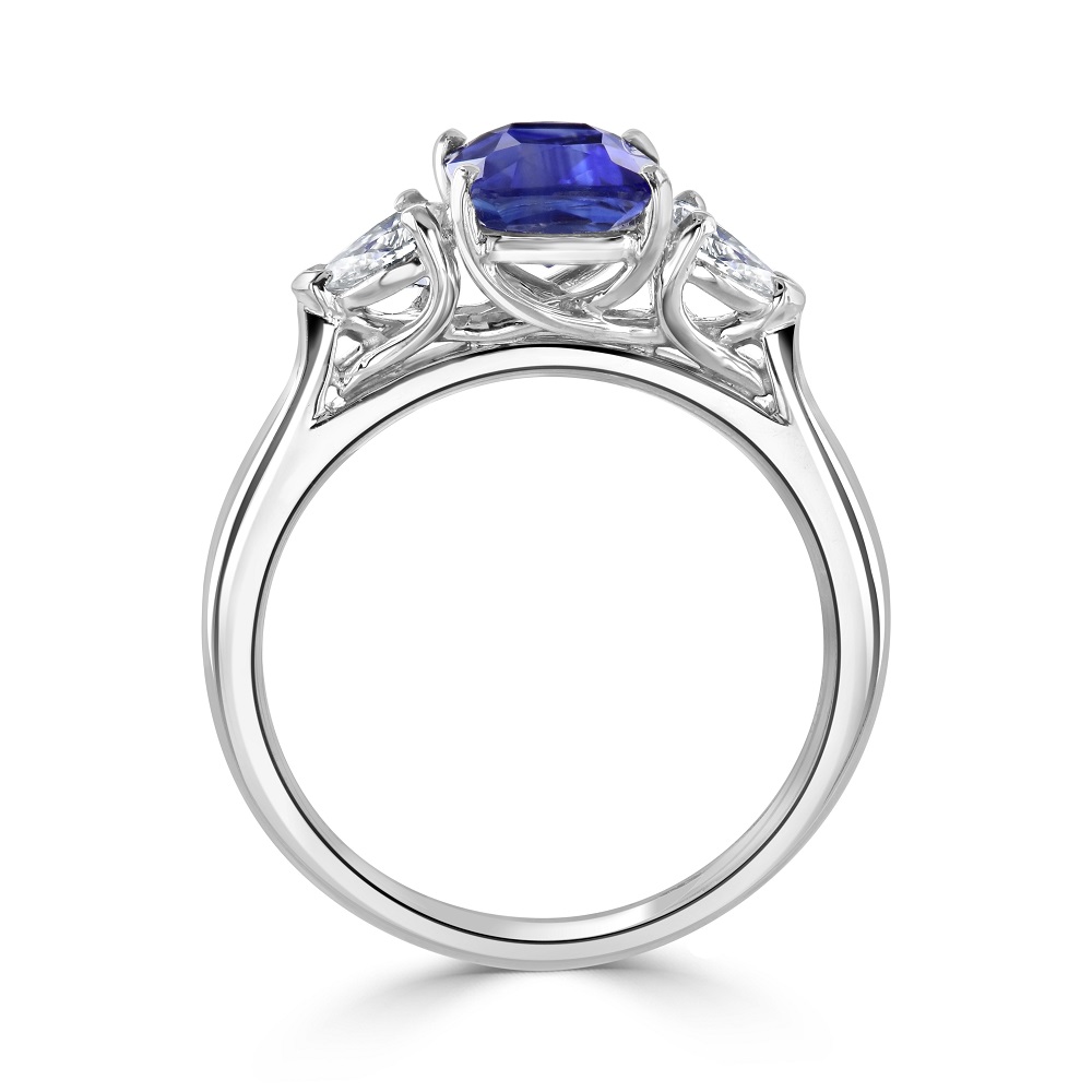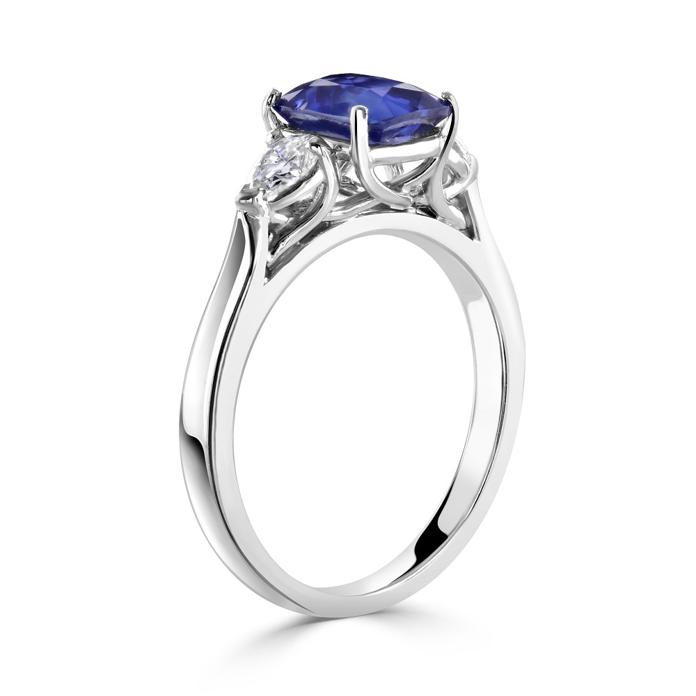 Flanking this magnificent centre gemstone, two claw set pear cut diamonds add an extra layer of sparkle and allure, with a combined total weight of 0.38ct. These diamonds are meticulously placed to complement the sapphire, enhancing its radiance and the ring's overall brilliance.