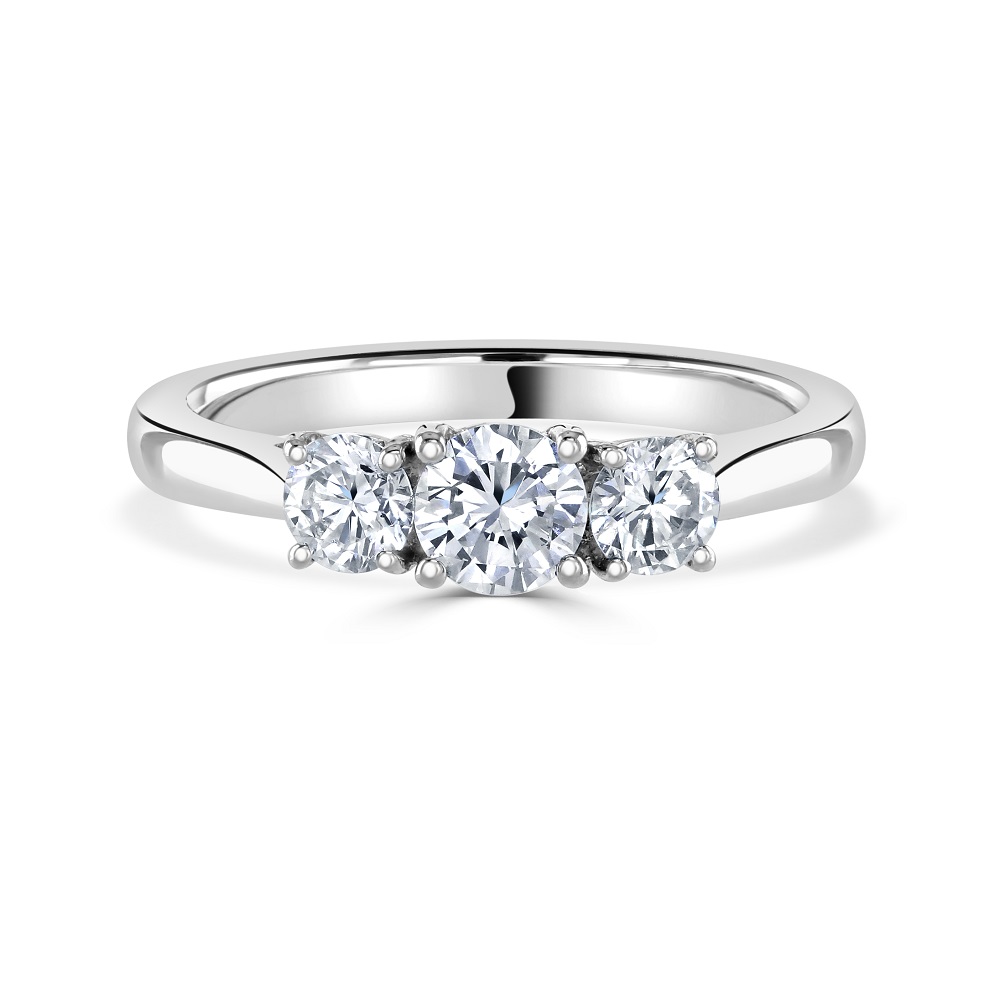 Celebrate your love story with this platinum diamond trilogy ring, a symbol of the past, present, and future. This elegant design features three round brilliant-cut diamonds in a refined four-claw setting, with the centre diamond (0.36ct) slightly larger to create a striking focal point. Two perfectly matched side diamonds, with a combined weight of 0.41ct, complete the harmonious composition. Crafted in premium platinum for strength and purity, this trilogy ring offers timeless sophistication and exceptional sparkle—an ideal choice for an engagement ring or a meaningful anniversary gift.