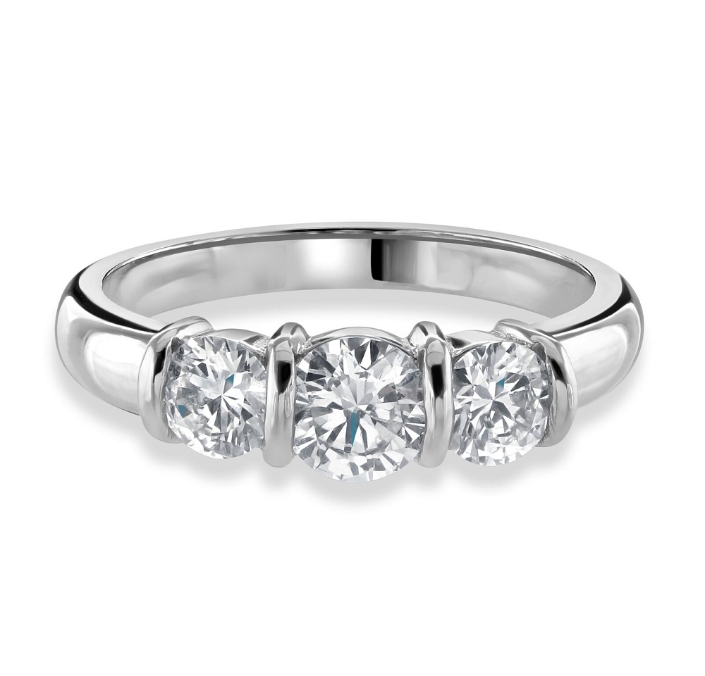 Our exquisite platinum trilogy ring is a symbol of timeless elegance and lasting commitment. This stunning piece features a trio of bar-set round brilliant cut diamonds that brilliantly capture and reflect light. The centre diamond, weighing 0.45 carats, is flanked by two slightly larger diamonds with a combined weight of 0.55 carats, bringing the total diamond weight to a dazzling 1.00 carat. Crafted from premium platinum, known for its durability and sleek finish, this ring is designed for those who appreciate a blend of classic sophistication and modern design. Perfect for an engagement, anniversary, or as a significant gift, this three stone ring is a sophisticated choice that celebrates past, present, and future.