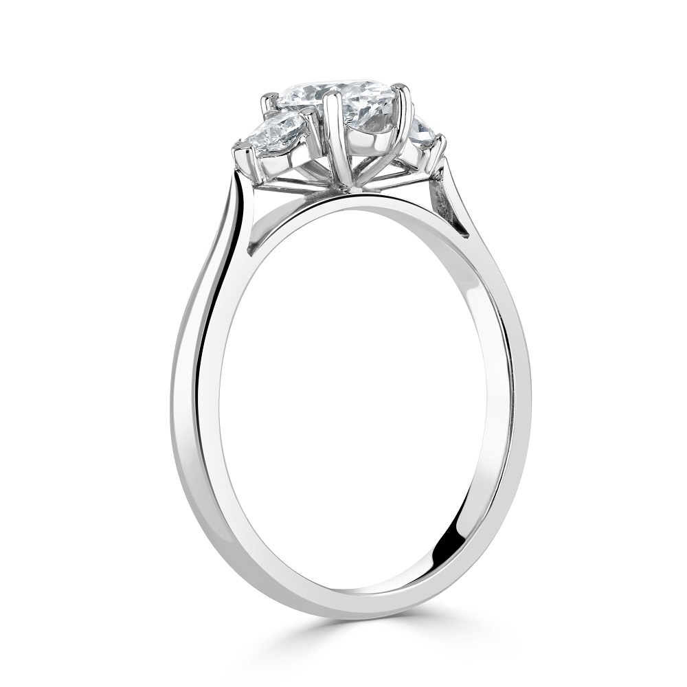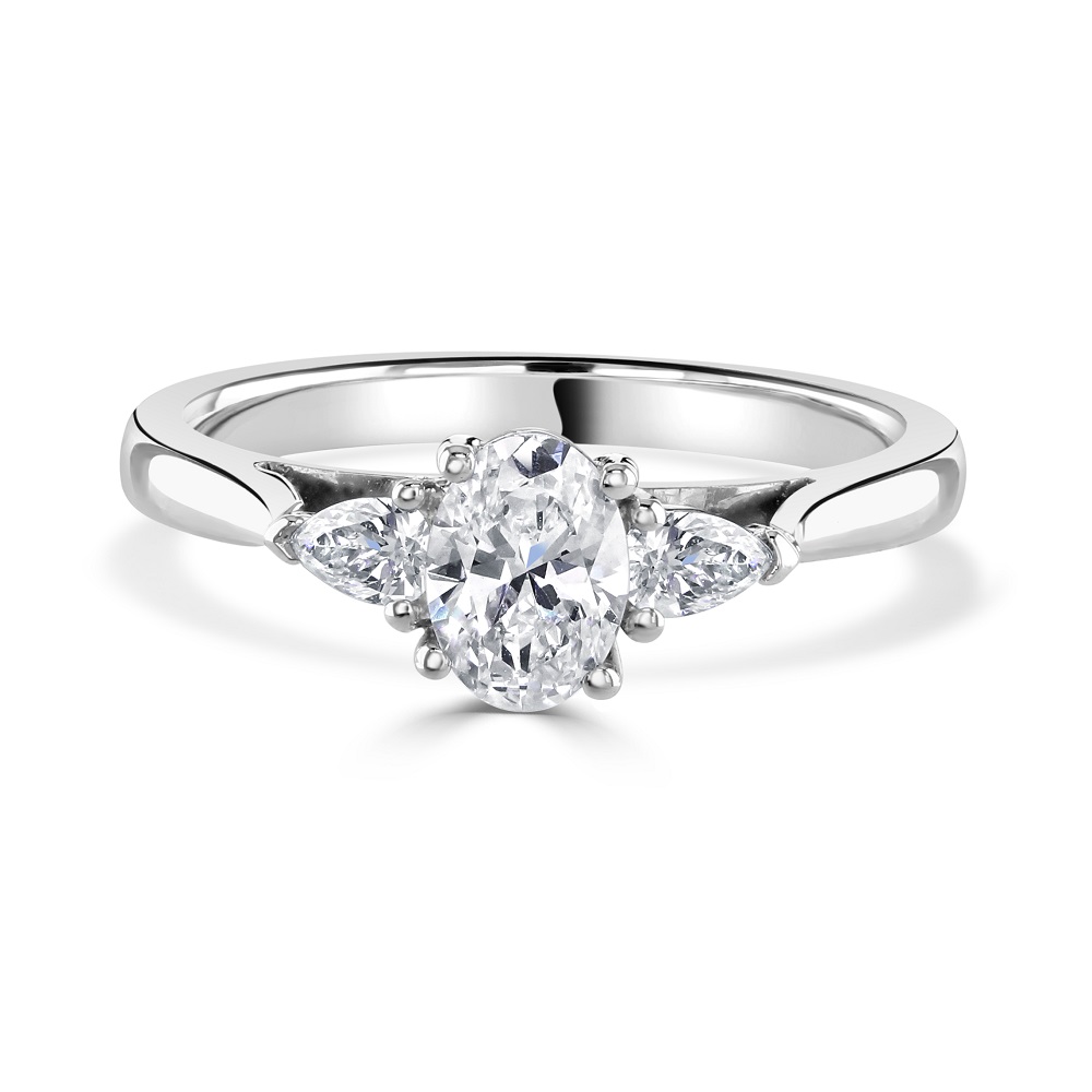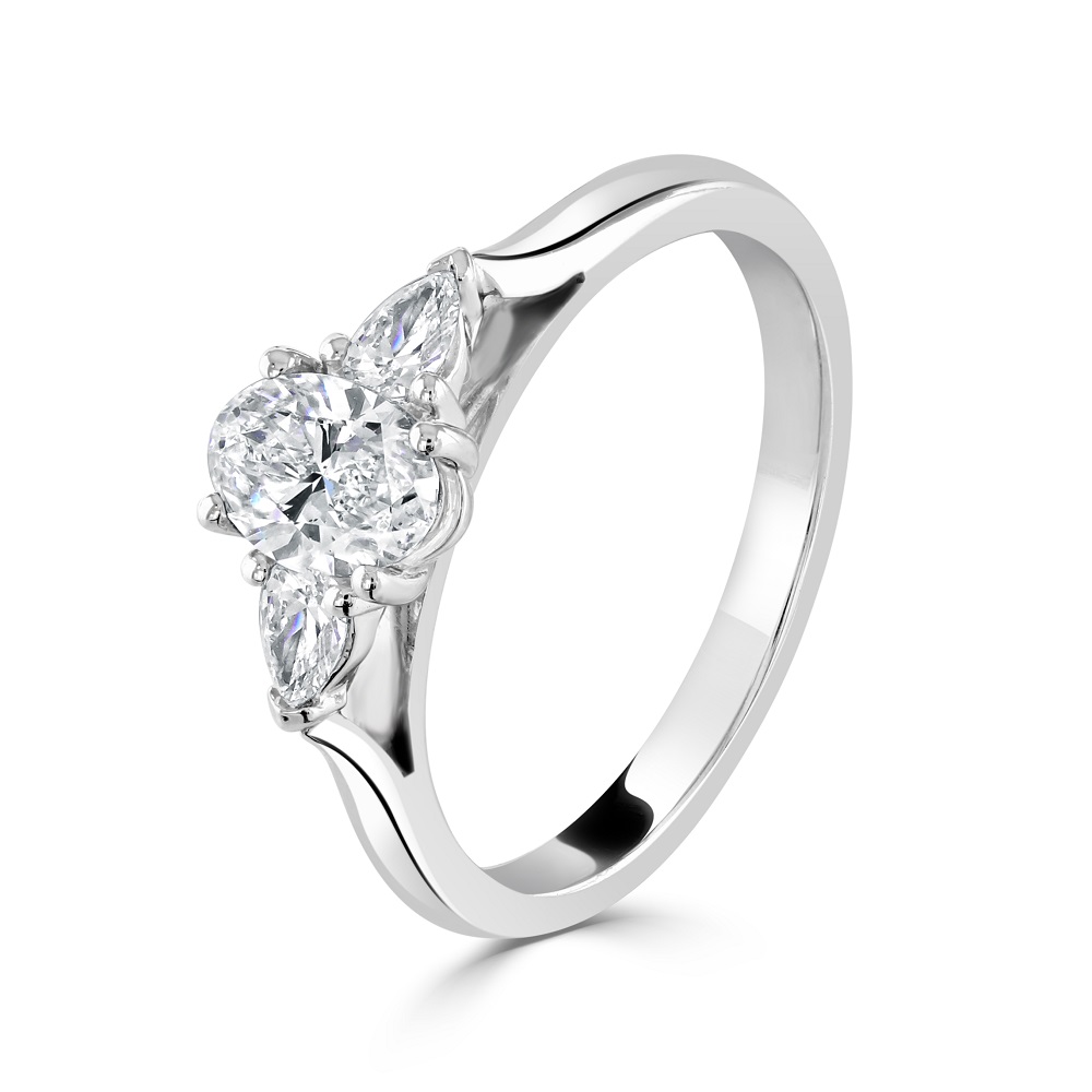 Experience the epitome of elegance with our platinum trilogy ring, an exquisite piece that symbolizes past, present, and future. At the centre, a GIA-certified oval cut diamond weighing 0.52ct is beautifully set with four claws, showcasing its clarity and colour (F). This stunning diamond is flanked by two pear cut diamonds, each claw set, adding a graceful contour to the design and bringing the side stones' total weight to 0.19ct. The ring's shank tapers elegantly, enhancing the overall delicate and sophisticated appearance. Crafted from high-quality platinum, this ring is perfect for those seeking a blend of classic style and contemporary elegance, ideal for engagements, anniversaries, or as a significant gift.