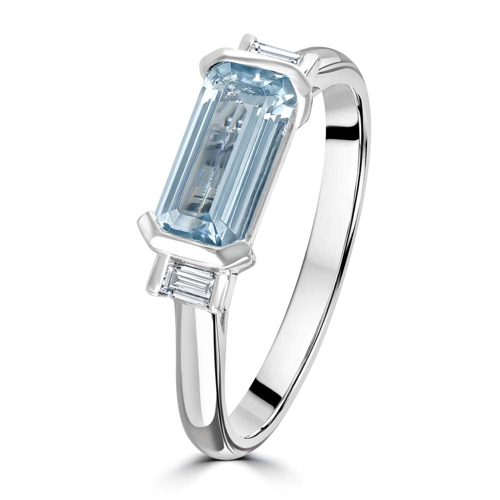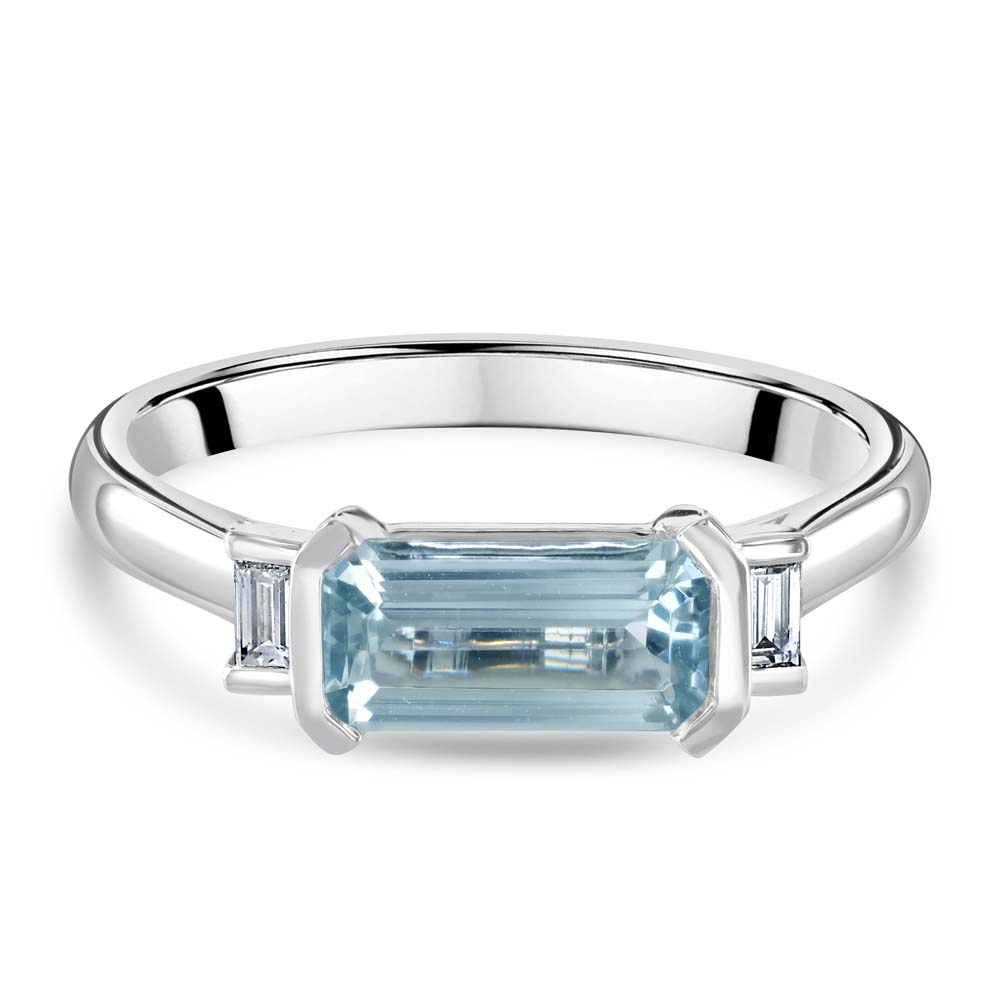 A modern interpretation of timeless elegance, this striking trilogy ring features a serene 1.06ct aquamarine, cut in a horizontal long octagon and semi rubover set at the centre. Its cool, crystalline hue is beautifully complemented by the sleek platinum setting and warm accents of 18ct yellow gold. Flanking the aquamarine are two baguette cut diamonds, semi rubover set to enhance the ring’s clean lines and contemporary silhouette. With a total diamond weight of 0.09ct, the design offers a subtle sparkle that perfectly balances the bold geometry of the central stone. Refined and distinctive, this ring is a sophisticated choice for those who appreciate understated luxury and modern design.