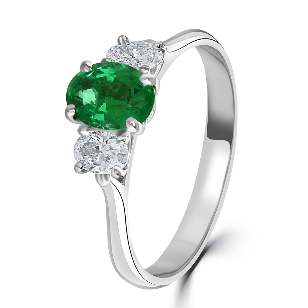 A beautiful deep green emerald and diamond trilogy engagement ring symbolising your past, present and future together. The oval cut emerald and the two sparkling oval cut diamonds are set off brilliantly in platinum. Like many of our rings this piece has been hand finished and set in in the UK. Other sizes and variations are available, please contact the store for more information.