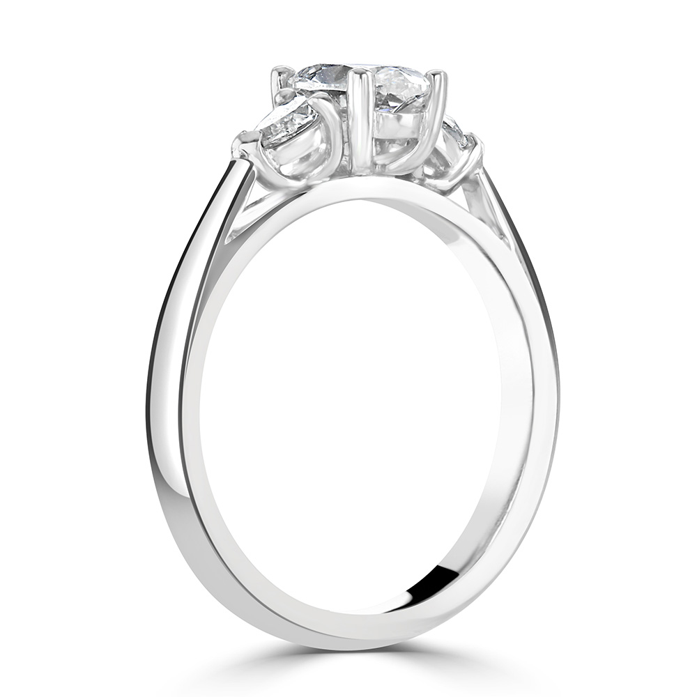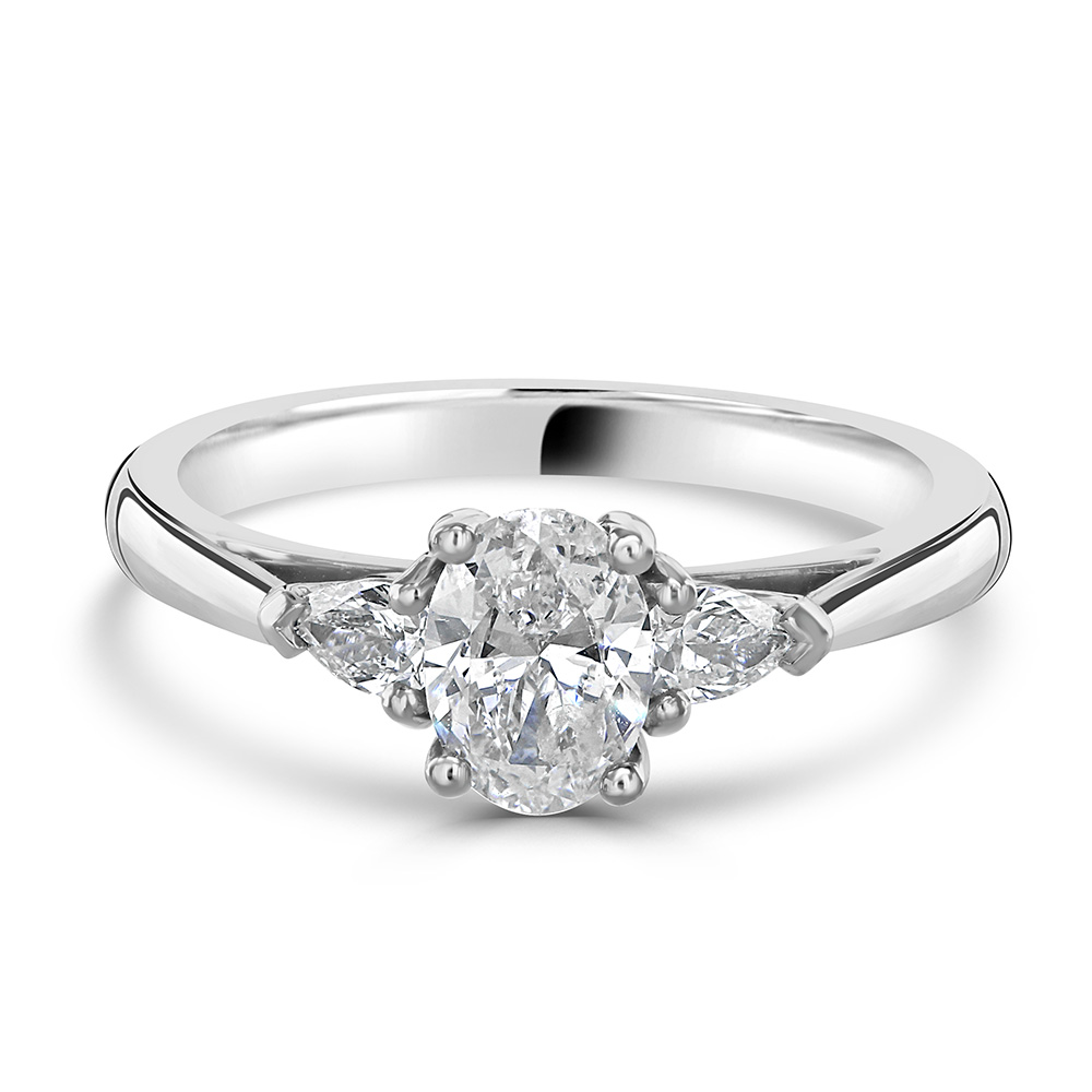 Crafted from the finest platinum, this trilogy ring offers not only a sleek and durable setting but also a symbol of enduring love and commitment. The unique combination of diamond cuts – the central oval flanked by elegant pears – presents a sophisticated silhouette that’s both modern and timeless.
