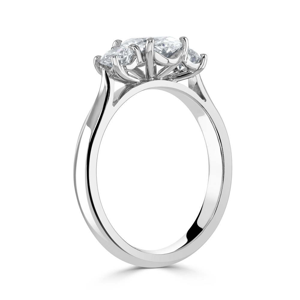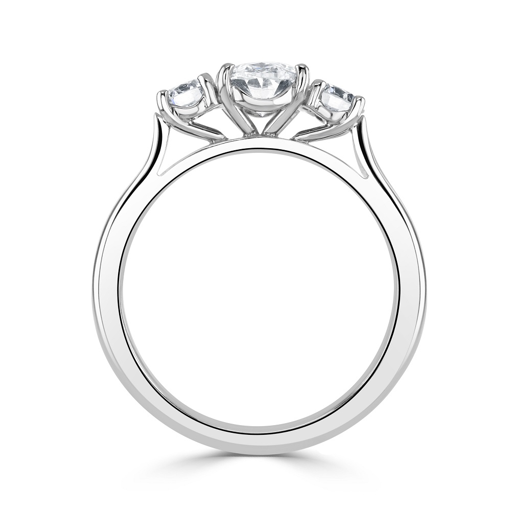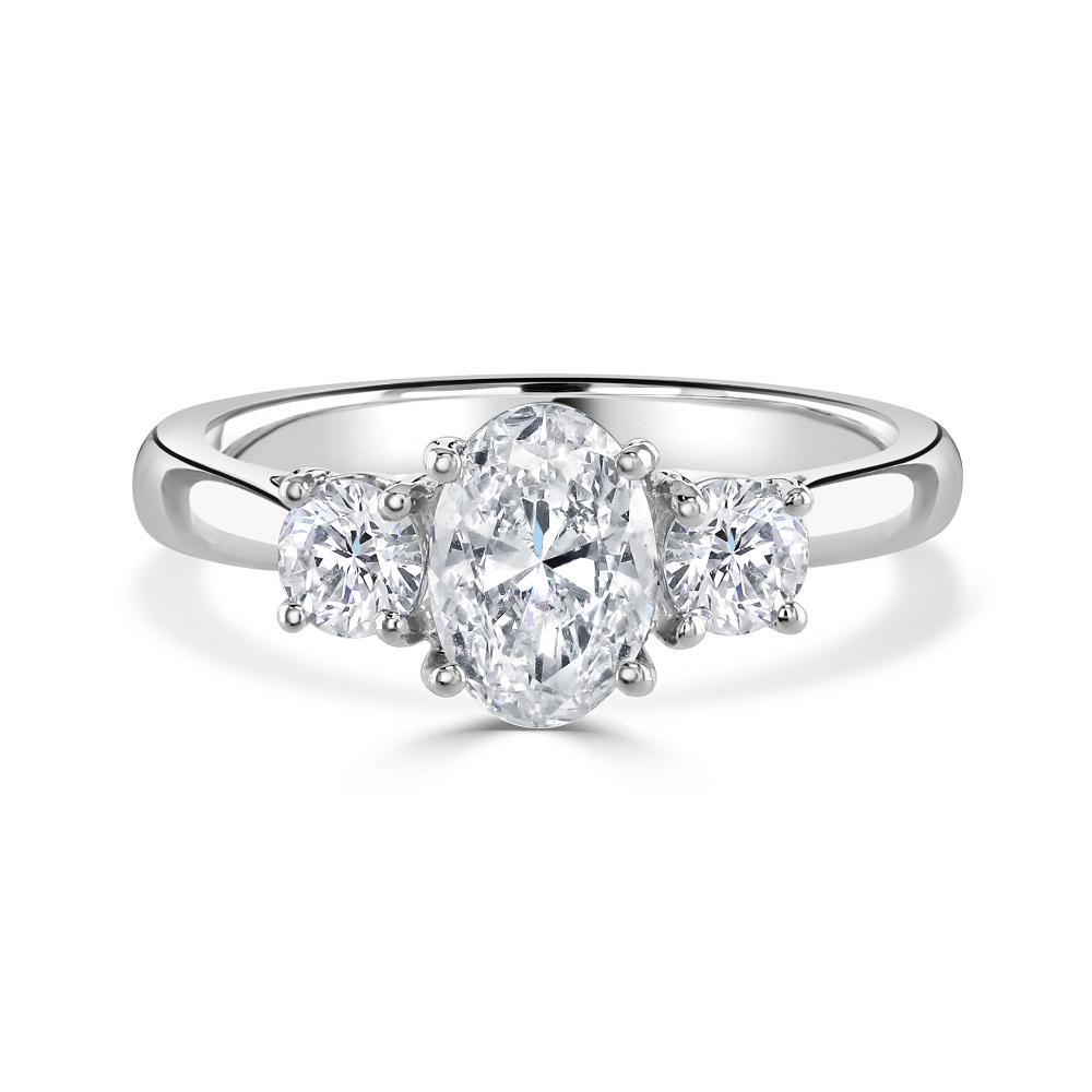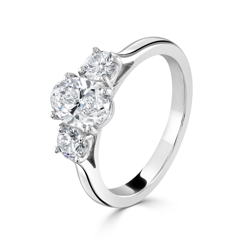 An exquisite platinum trilogy ring, masterfully crafted to feature a captivating centre oval cut diamond, meticulously set in a 4-claw design for maximum brilliance. This centrepiece is flanked by two resplendent round brilliant cut diamonds, enhancing its elegance and sophistication. The central oval diamond, weighing an impressive 0.90ct, boasts a GIA-certified F colour and VS2 clarity, ensuring a dazzling display of light. Complementing the central stone, the side diamonds add up to a total weight of 0.41ct, perfectly balanced for a harmonious and radiant finish. Whether you're marking a special occasion, celebrating an engagement, or simply treating yourself to a piece of timeless beauty, this trilogy ring is sure to enchant and delight.