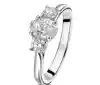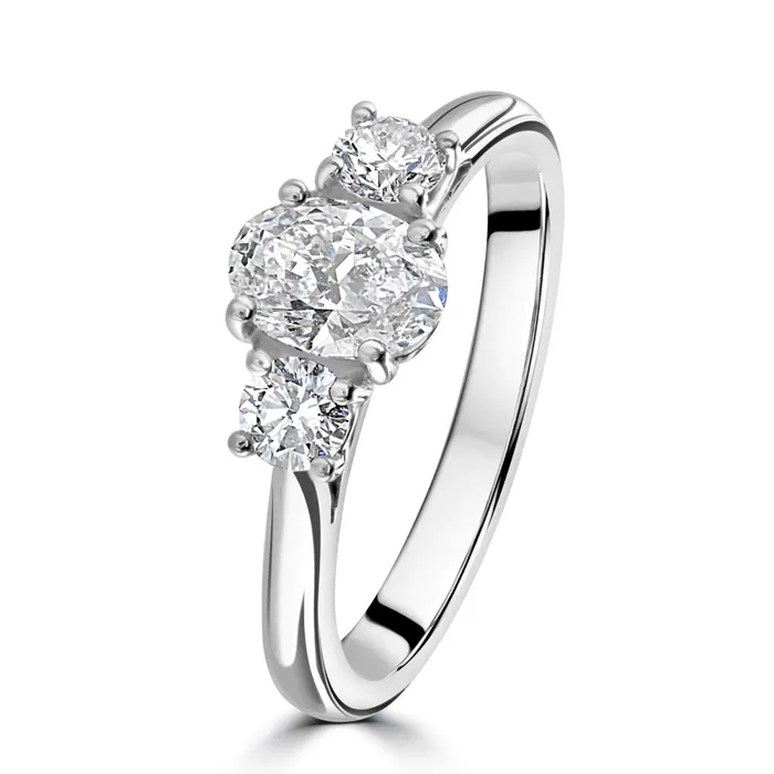 Discover the timeless elegance of our platinum trilogy ring, featuring a stunning oval cut diamond set in a secure four-claw setting at the centre. This exquisite design is complemented by a single round brilliant cut diamond claw set on either side, creating a harmonious and captivating display of brilliance. The centrepiece of this luxurious ring is a GIA-certified oval cut diamond, weighing 0.70 carats. With a G colour grade, the diamond offers near-colourless brilliance that captures the eye. The VS2 clarity grade ensures exceptional sparkle, with inclusions that are only visible under magnification, allowing the diamond’s natural beauty to shine through. The two round brilliant cut diamonds on either side further enhance the ring’s overall radiance and sophistication. Crafted from premium platinum, this trilogy ring combines timeless beauty with enduring durability. The classic three-stone design symbolizes the past, present, and future of your love story, making it a perfect choice for engagements, anniversaries, or any significant celebration. Ideal for those who appreciate refined elegance and exceptional craftsmanship, this platinum trilogy ring is a true symbol of everlasting love.
