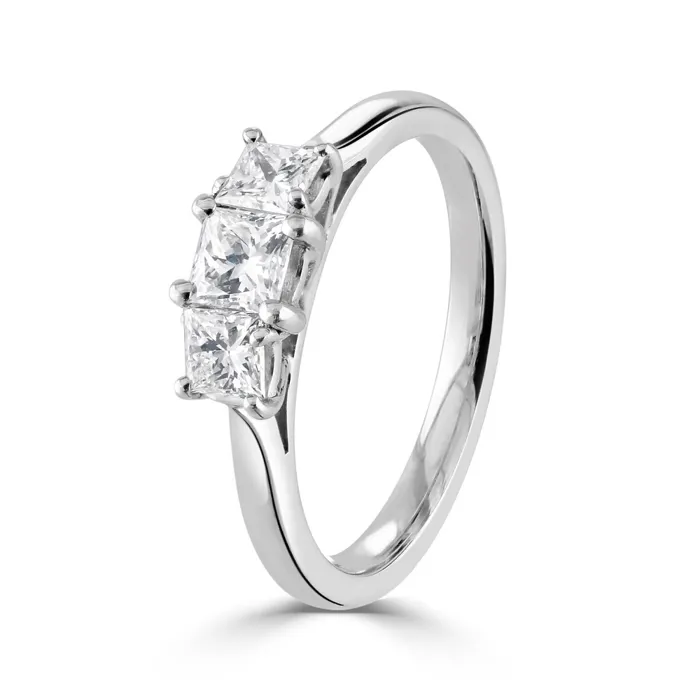 Embrace the allure of our exquisite platinum ring, featuring three meticulously claw-set princess cut diamonds. The centrepiece is a stunning 0.33ct diamond flanked by two additional diamonds, with a combined weight of 0.42ct. This trio of diamonds is beautifully mounted on a sleek platinum setting, known for its strength and luminous finish, enhancing the geometric beauty and brilliance of the princess cut stones. Perfect for engagements, special anniversaries, or as a luxurious gift, this ring is crafted to captivate and charm, offering a timeless elegance that is sure to be treasured for generations.