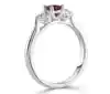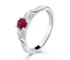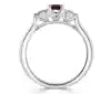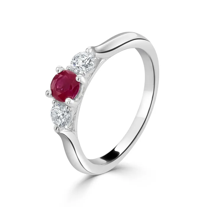 An elegant platinum three-gemstone ring, meticulously crafted to showcase a magnificent centre ruby and two dazzling diamonds. The central round ruby, weighing 0.45 carats, is securely held by four claws, radiating a rich, captivating colour. Flanking this stunning gem are two round brilliant cut diamonds, each weighing a total of 0.28 carats, set in a unique three-claw design that enhances their brilliance. The ring's design is completed with a gracefully tapered shank, lending a sleek and sophisticated silhouette. This ring is a timeless choice for those who appreciate the perfect balance of luxury and style, making it an ideal selection for engagements, special anniversaries, or as a standout addition to any jewellery collection.