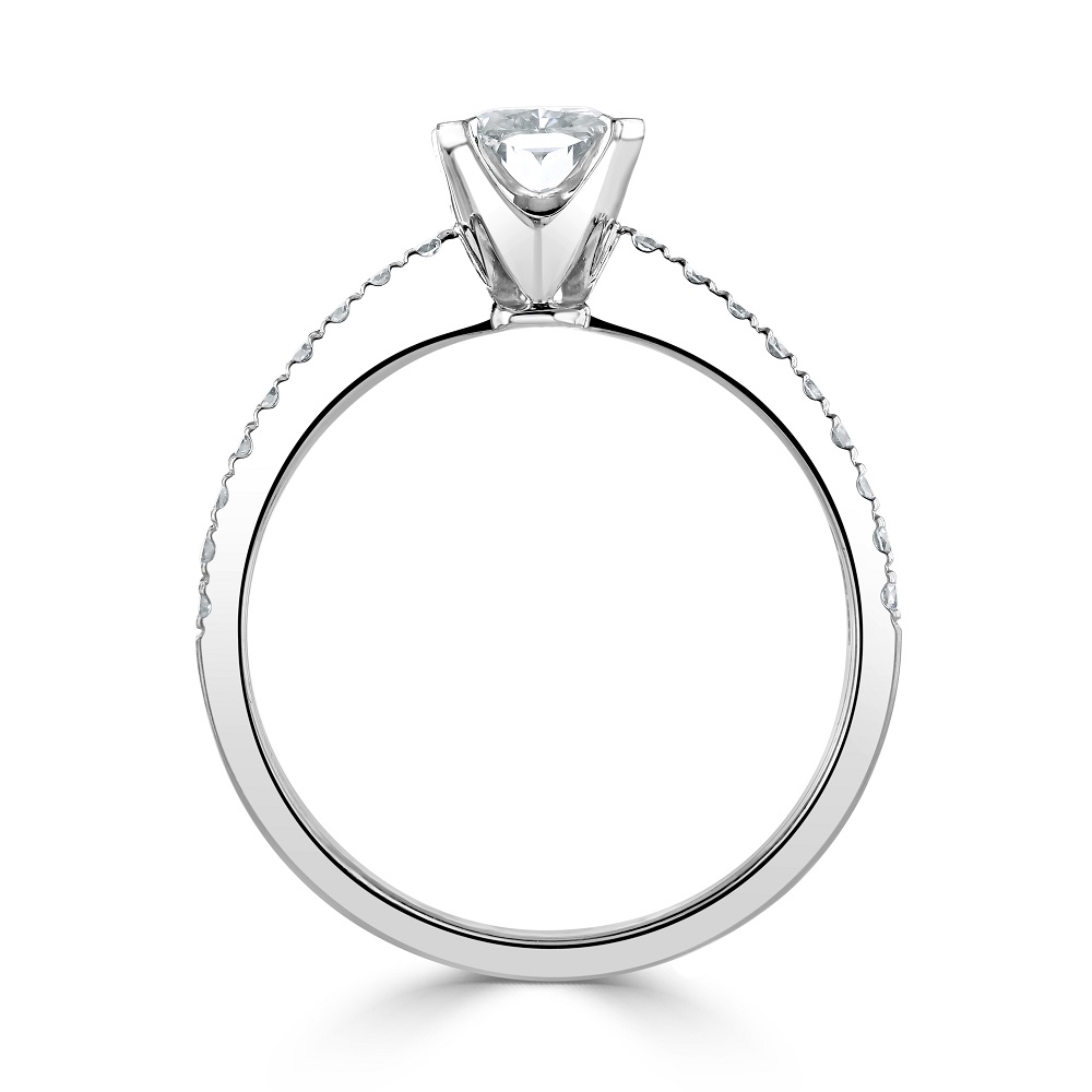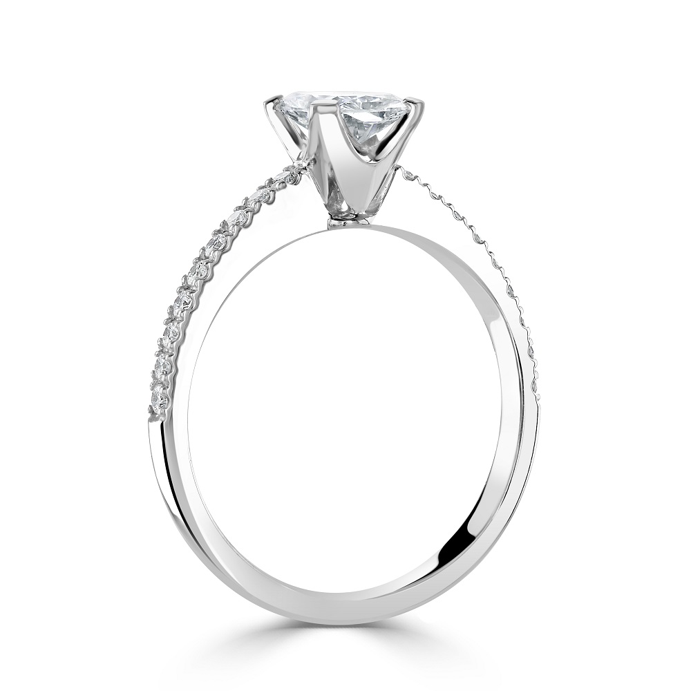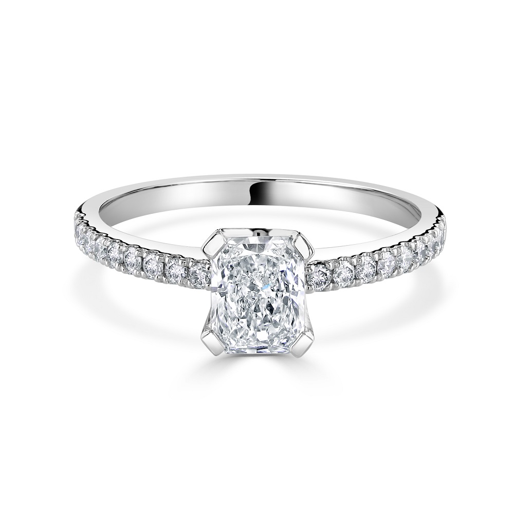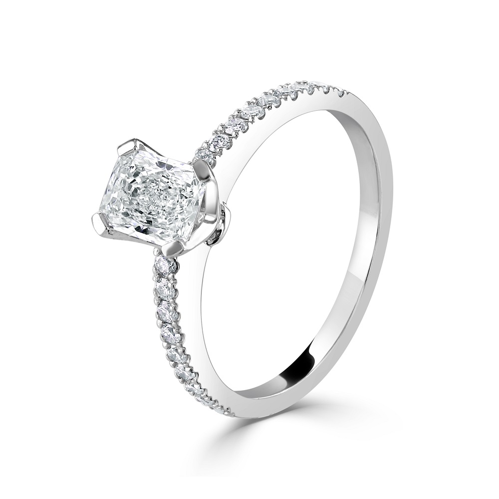 Accentuating the magnificence of the centre diamond, the ring's shoulders are adorned with round brilliant cut diamonds, each claw set to perfection. These diamonds add an extra layer of radiance and elegance to the ring, creating a stunning contrast against the sleek platinum band. The combination of the rectangular diamond's unique cut and the brilliance of the round diamonds makes this ring a symbol of your unique love story, filled with moments of sparkle and elegance.