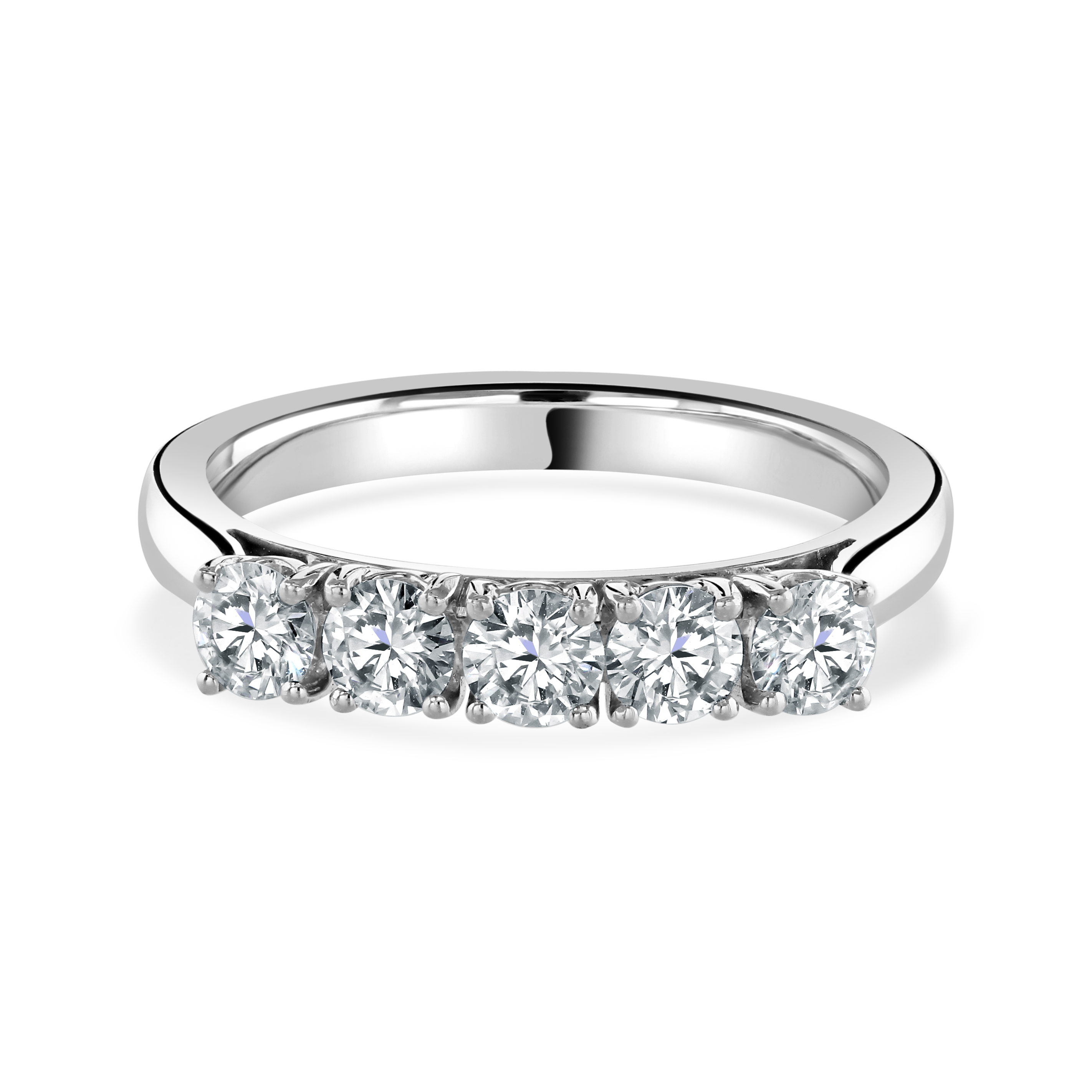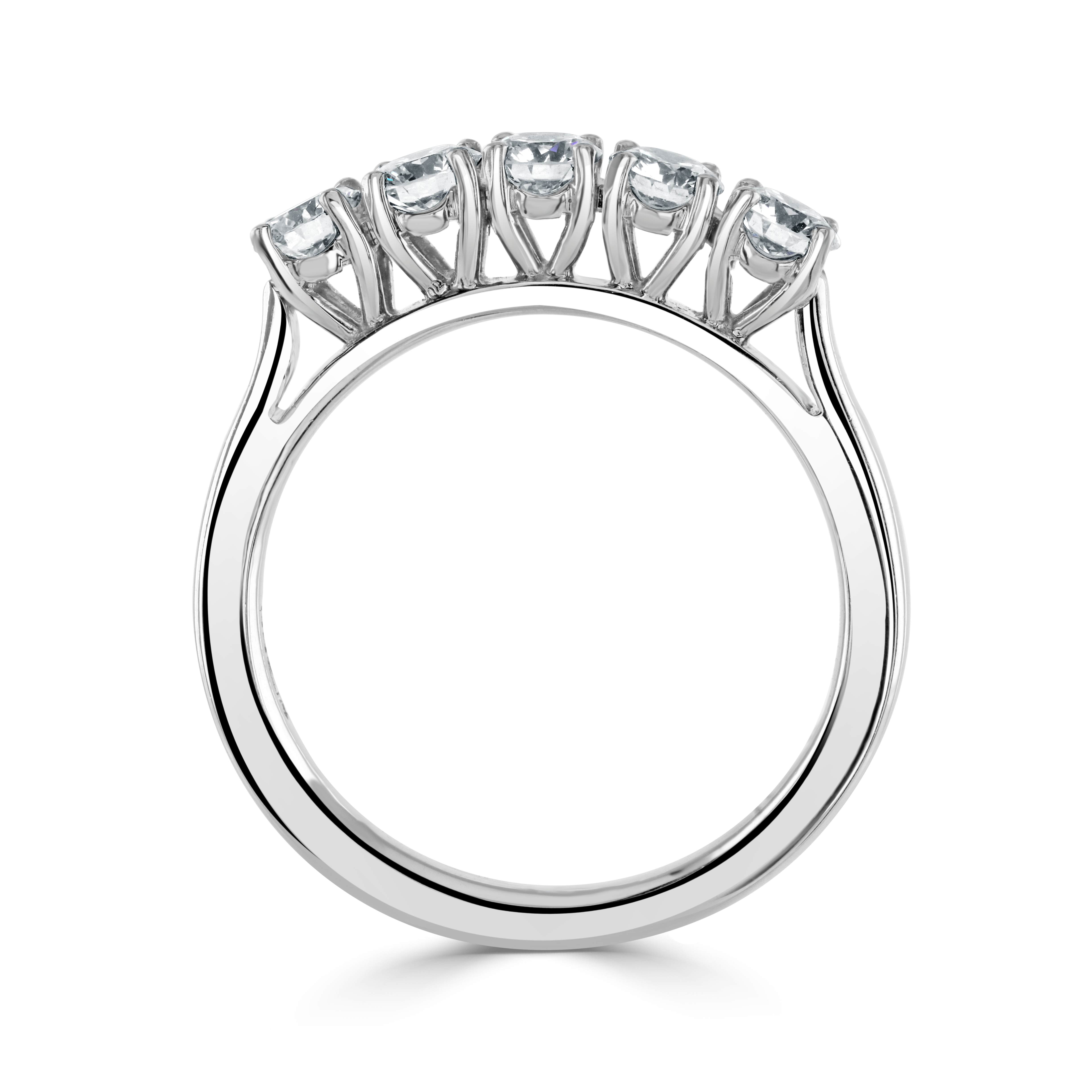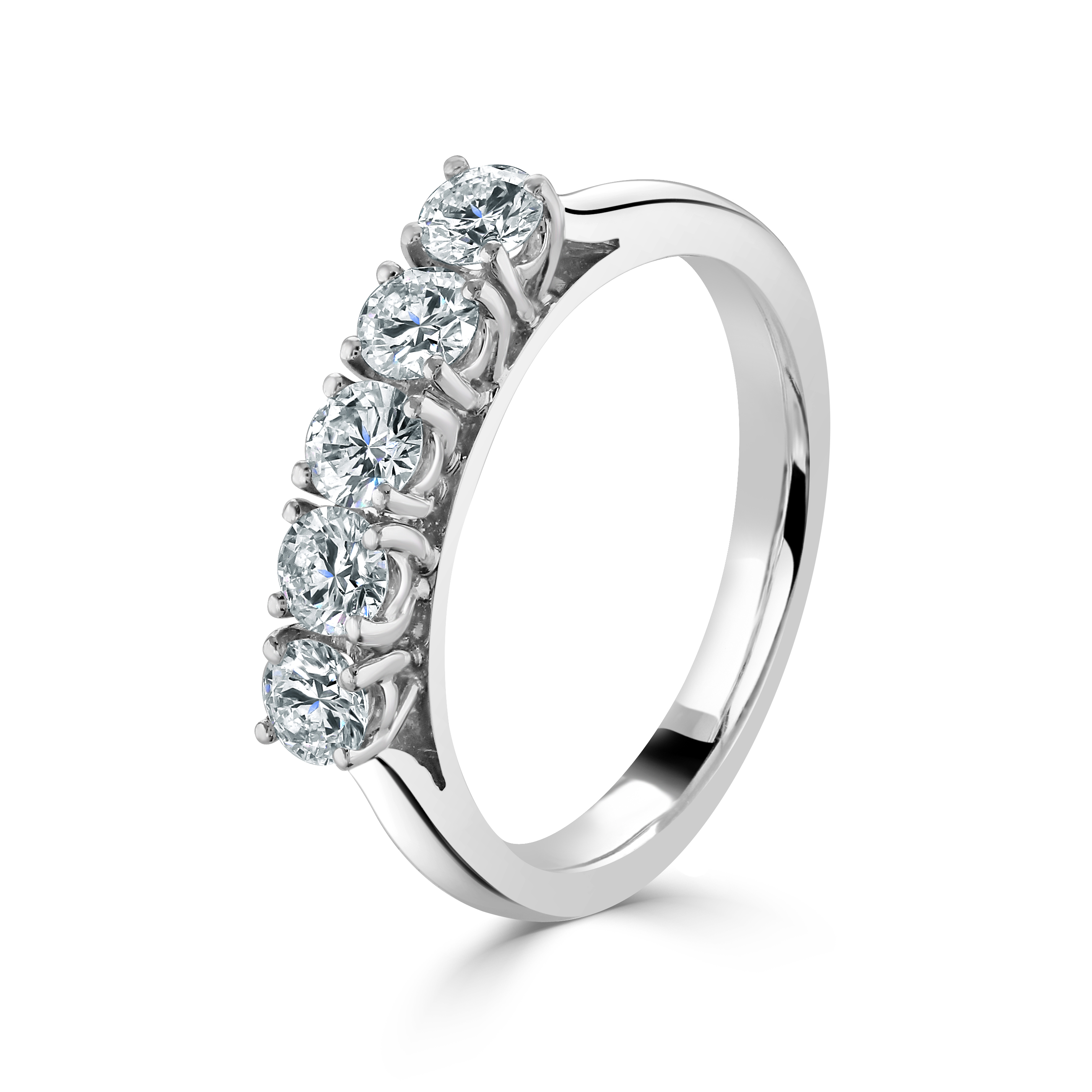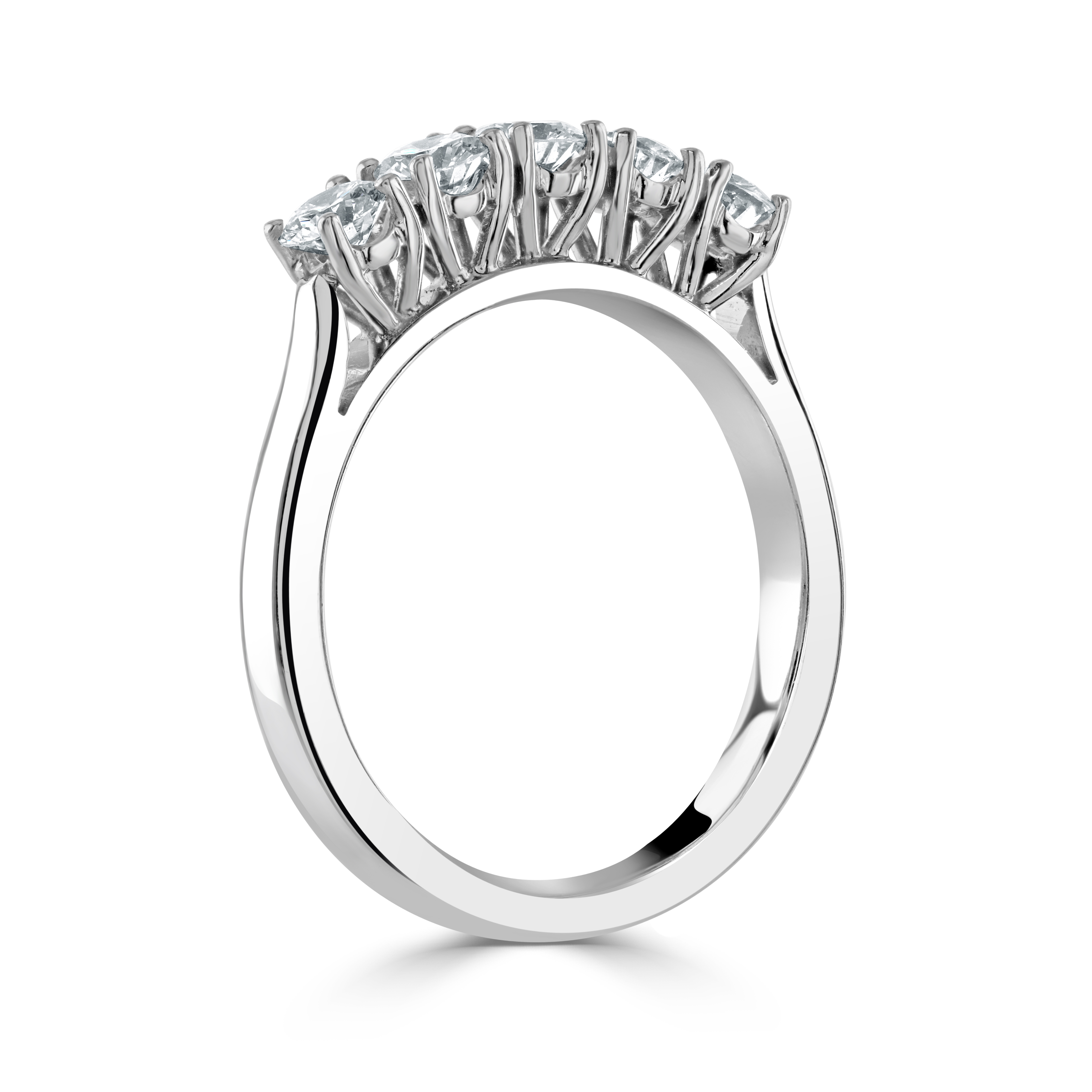 Introducing our exquisite platinum 5 diamond ring, a masterpiece of fine craftsmanship and elegant design. This luxurious ring features five round brilliant cut diamonds, each meticulously set in an underwired claw setting to enhance their natural brilliance and total diamond weight of 0.74 carats. Crafted from premium platinum, known for its strength and durability, this ring showcases a sleek and polished finish that perfectly complements the sparkle of the diamonds. Ideal for celebrating significant milestones or as an opulent addition to any jewellery collection, this 5 stone diamond ring offers a timeless appeal and sophistication that will captivate and enchant for generations.