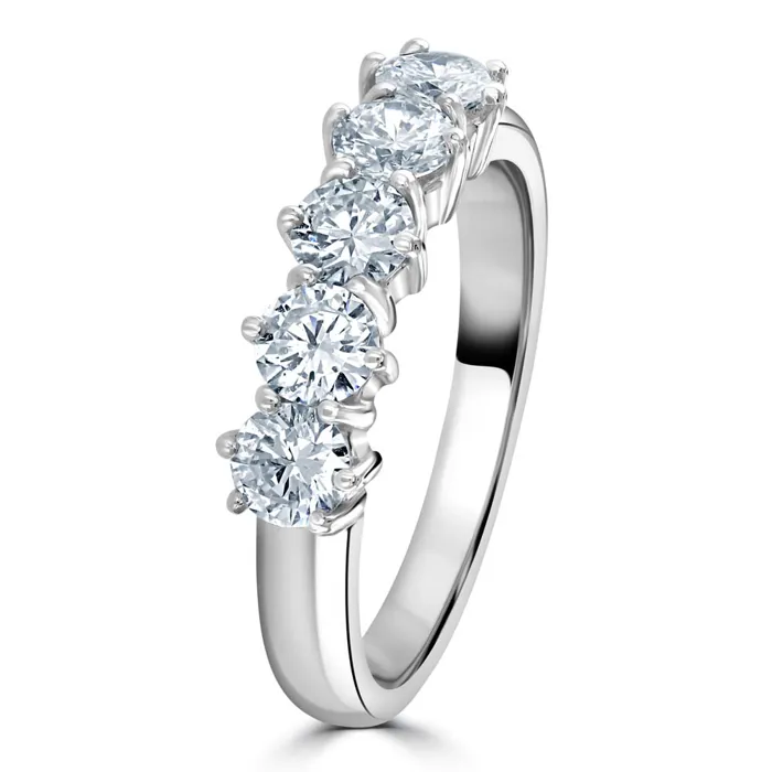 A timeless platinum eternity ring, a symbol of enduring love and sophistication. This exquisite ring is claw-set with five round brilliant cut diamonds, each chosen for its exceptional sparkle and clarity, totalling 1.01 carats in diamond weight. Crafted from premium platinum, this ring offers unmatched durability and a sleek, modern finish that enhances the brilliance of the diamonds. The claw setting elevates each stone, allowing light to enter from multiple angles and creating an impressive display of luminosity. Ideal for an anniversary, a special milestone, or as a meaningful gift, this eternity ring represents a lasting commitment and is sure to be cherished for generations. Embrace the blend of classic design and contemporary elegance with this stunning platinum diamond ring, a perfect choice for those who appreciate the finer things in life.
