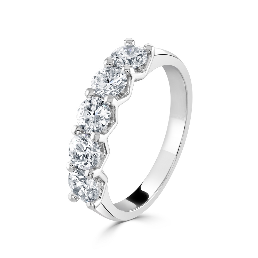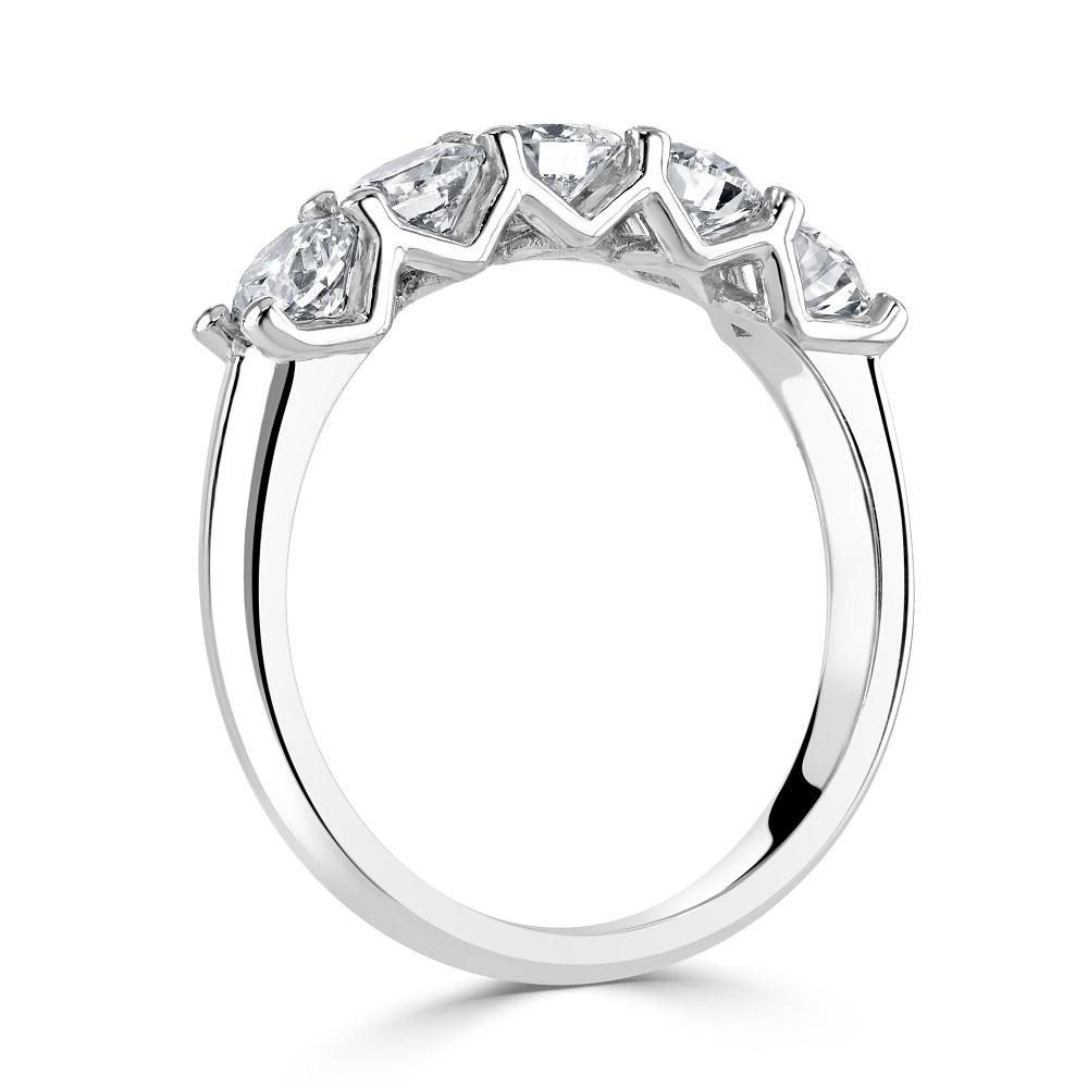 Discover the exquisite elegance of our platinum half eternity ring, featuring five stunning round brilliant cut diamonds, each securely set in a four-claw V collet setting. This luxurious ring is designed to symbolize everlasting love and commitment, making it the perfect choice for anniversaries, milestones, or any special occasion. The total diamond weight of this remarkable ring is 1.29 carats, ensuring a dazzling display of brilliance and fire. Each diamond is carefully selected for its exceptional quality, with the four-claw V collet setting allowing maximum light to pass through, enhancing their natural sparkle and radiance. Crafted from premium platinum, this half eternity ring combines timeless beauty with enduring durability. The sleek and sophisticated design ensures a comfortable fit while highlighting the brilliance of the diamonds. Ideal for those who appreciate refined elegance and superior craftsmanship, this platinum half eternity ring is a true symbol of everlasting love and sophistication.