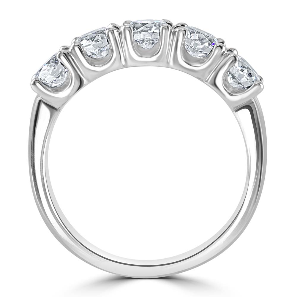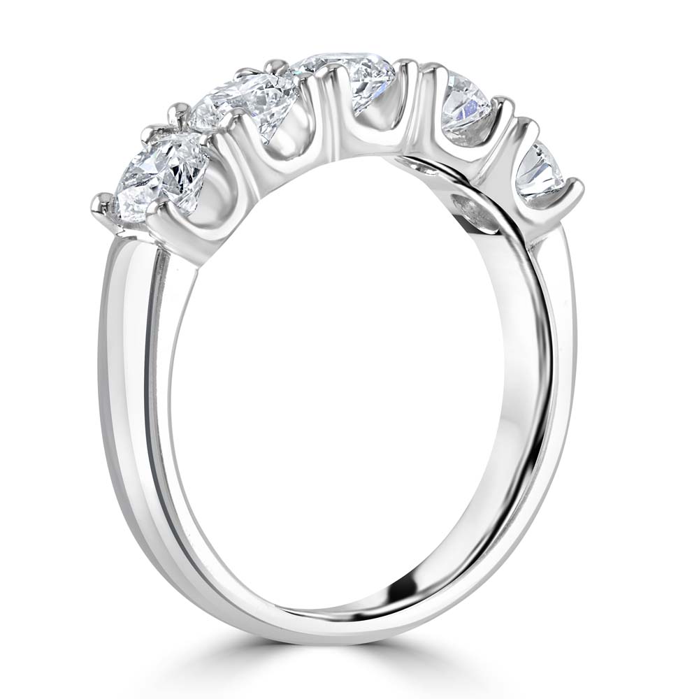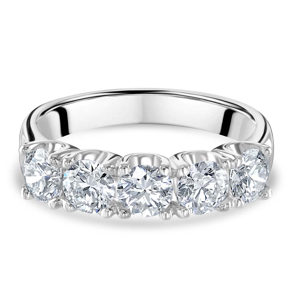 A timeless celebration of brilliance and balance, this exquisite five-stone ring is crafted in pure platinum and showcases five round brilliant cut diamonds, each meticulously set in classic four-claw settings. With each diamond weighing 0.30ct, the total carat weight of 1.50ct offers a radiant display of symmetry and sparkle. Graded E for colour and VS2 for clarity, these exceptional diamonds reflect superior quality and craftsmanship, making this ring a perfect expression of enduring elegance. The sleek platinum band enhances the luminosity of each stone, creating a refined silhouette that transitions effortlessly from day to evening. Ideal for marking a milestone or celebrating a lasting bond, this five-stone ring is a sophisticated statement of love and luxury.