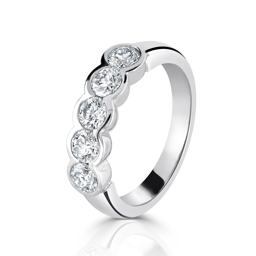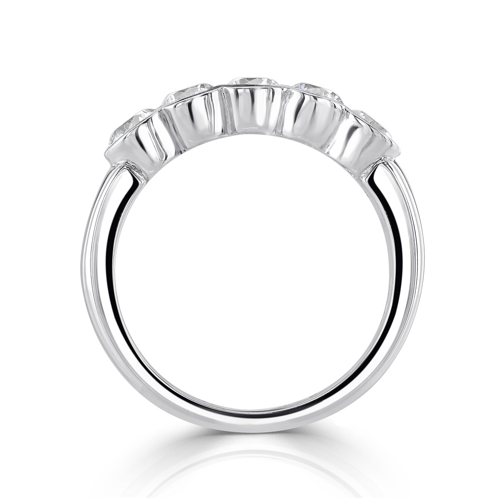 Experience our sophisticated platinum five diamond eternity ring, a luxurious symbol of everlasting love. This ring features five round brilliant cut diamonds, each securely rubover set, totalling 1.02 carats. The rubover setting not only protects each diamond but also enhances its natural brilliance, allowing the light to reflect beautifully across the stones. Crafted from premium platinum, this ring boasts exceptional durability and a timeless, sleek design that makes it a perfect choice for an anniversary, wedding band, or a special celebratory gift. Embrace this stunning piece of fine jewellery that promises to add a touch of elegance and everlasting sparkle to your collection.