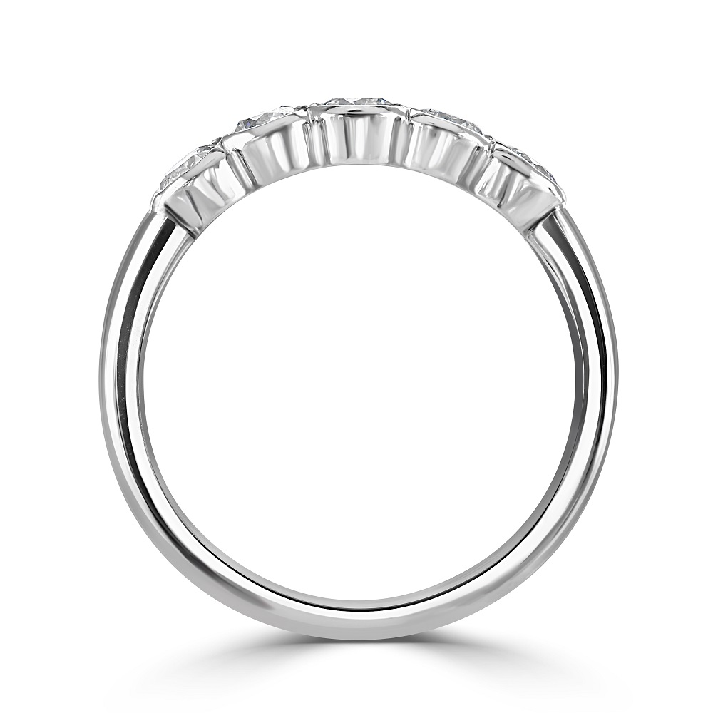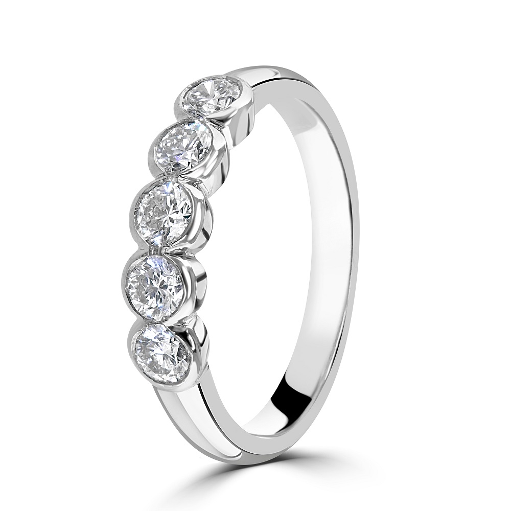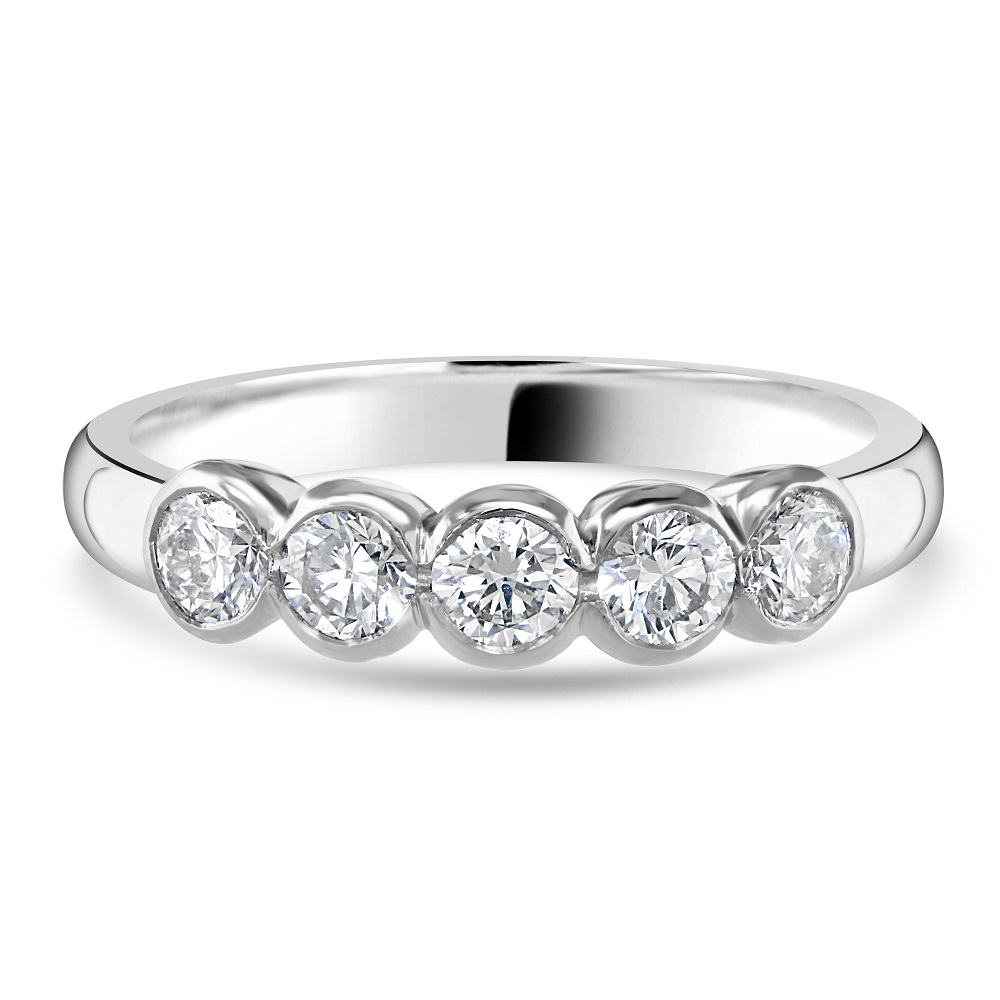 Experience the timeless elegance of our platinum ring, beautifully showcasing five round brilliant cut diamonds with a total weight of 0.72 carats. Each diamond is expertly rubover set, creating a sleek and modern profile that enhances the stones' natural brilliance and fire. The secure setting ensures each diamond is protected while providing a smooth finish that's comfortable for everyday wear. Crafted from premium platinum, this ring combines durability with a refined aesthetic, making it perfect for those who appreciate sophisticated, minimalist jewellery. Ideal for special occasions or as a luxurious everyday accessory, this diamond ring offers both glamour and elegance to any ensemble.