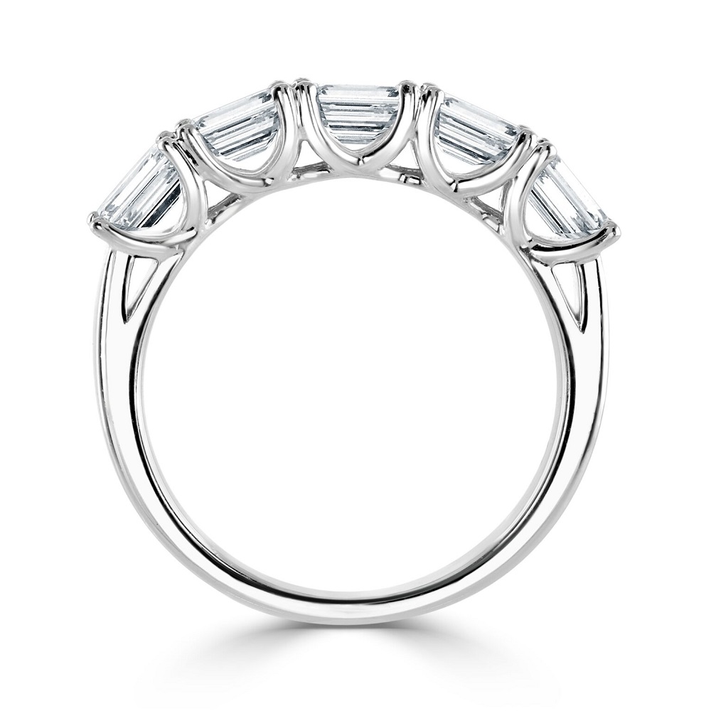 A sophisticated platinum emerald cut diamond ring that exudes timeless elegance and unparalleled luxury. This exquisite ring features five emerald cut diamonds, each meticulously four-claw set across the finger, presenting a breathtaking display of clarity, cut, and luminous brilliance. With a total diamond weight of 1.52ct, these diamonds have been carefully selected for their exceptional quality and captivating sparkle, ensuring a stunning visual impact from every angle.