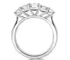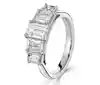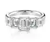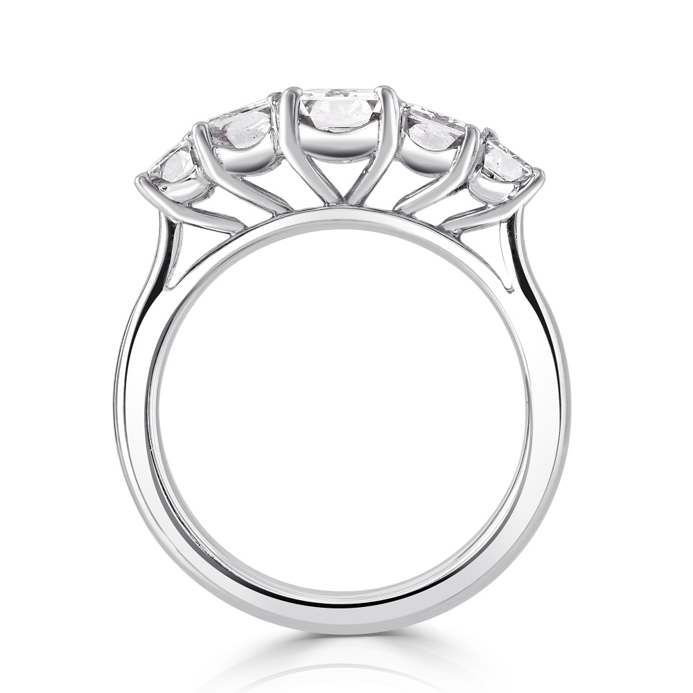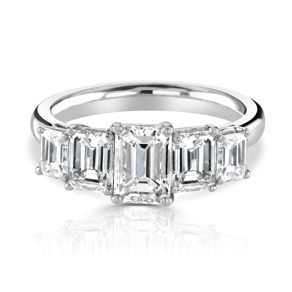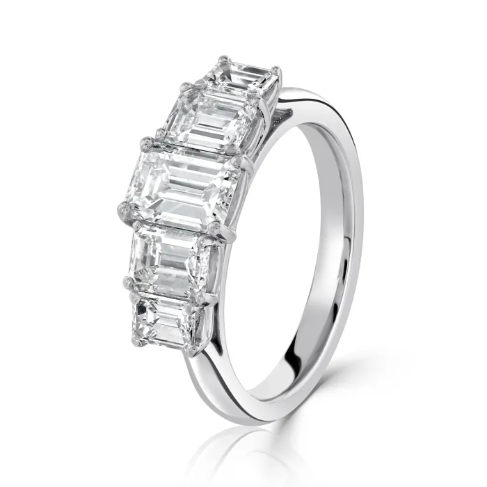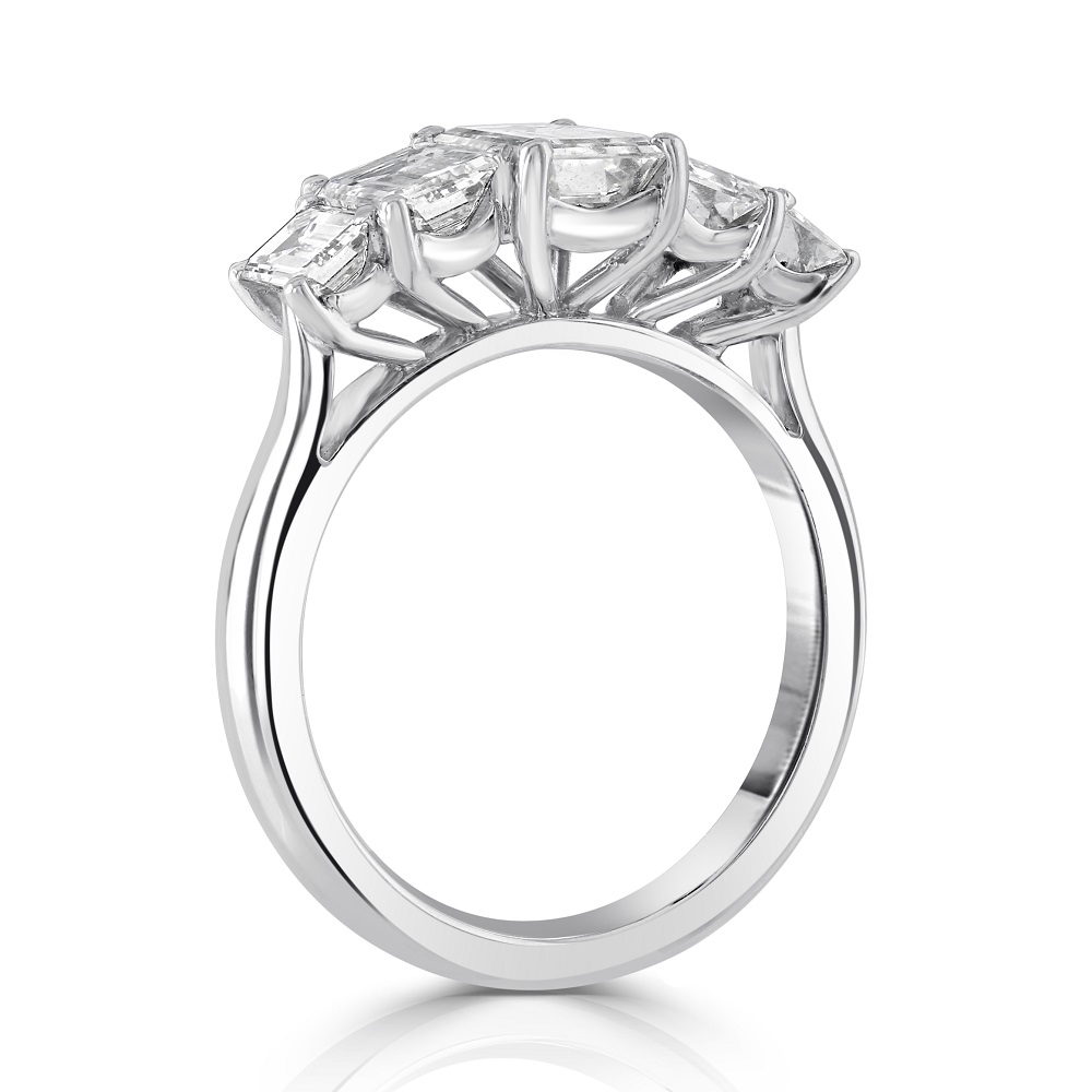 Our stunning platinum ring features an exquisite arrangement of five emerald cut diamonds. This masterpiece is designed with under-wire claw settings that gracefully hold each diamond, creating a seamless flow that accentuates their natural brilliance and clarity. The centrepiece of this elegant ring is a captivating 1.03ct emerald cut diamond, boasting an impressive colour grade of F and clarity of VS1. This central diamond is flanked by four additional emerald cut diamonds, carefully selected to graduate in size, contributing to the ring's sophisticated and balanced appearance. The total diamond weight of this magnificent piece is 2.58ct, ensuring a dazzling display of light and luxury. Crafted from the finest platinum, this ring offers a sleek and timeless setting that complements the diamonds' beauty, providing a secure and refined backdrop for their exceptional brilliance. The under-wire claw setting not only enhances the visual appeal of the diamonds but also allows maximum light to enter, amplifying their sparkle and fire. This Platinum Ring with its graduated emerald cut diamonds is the epitome of elegance and craftsmanship. Whether celebrating a special occasion, marking an important milestone, or simply indulging in the beauty of fine jewellery, this ring promises to be a cherished addition to any collection, offering timeless beauty and unparalleled sophistication.