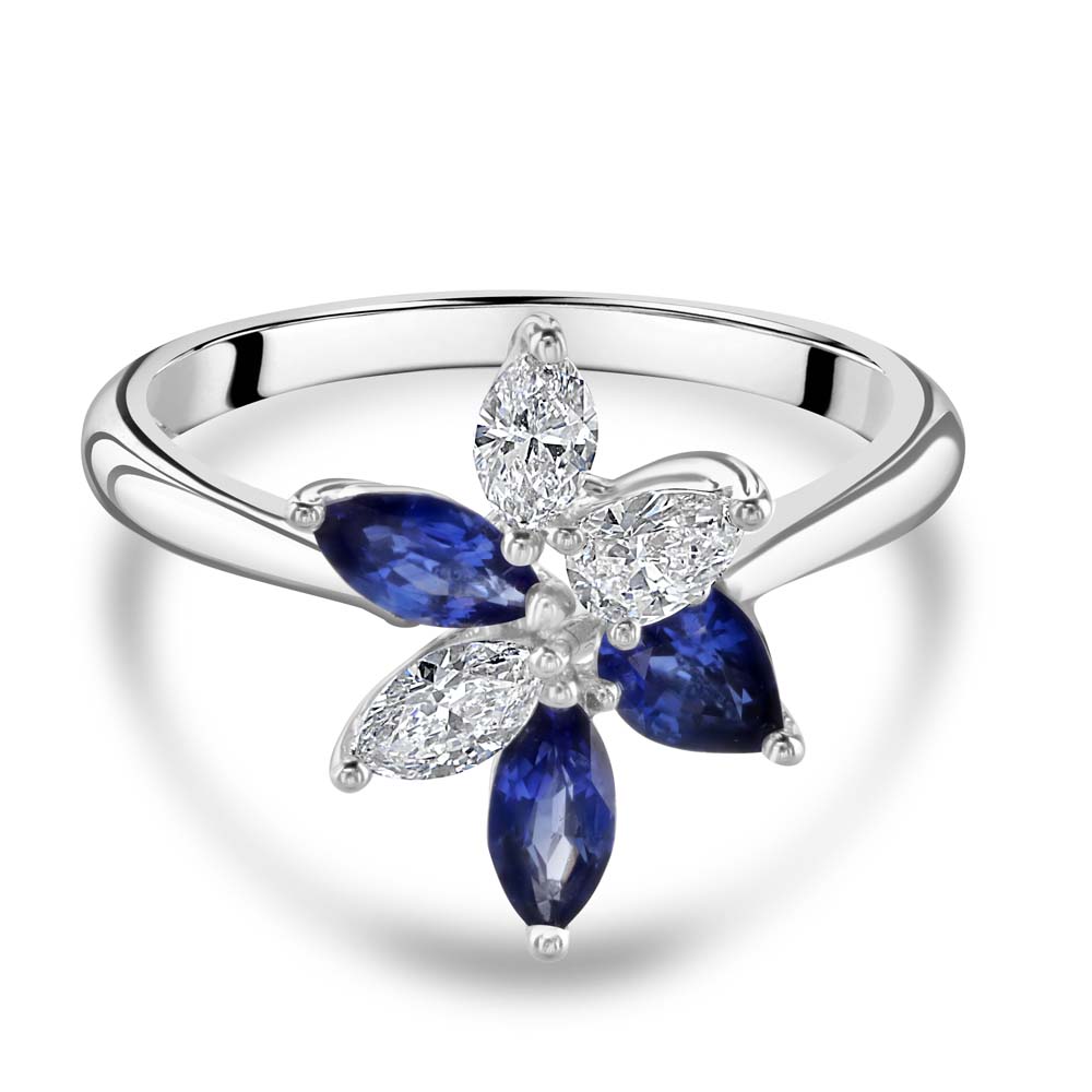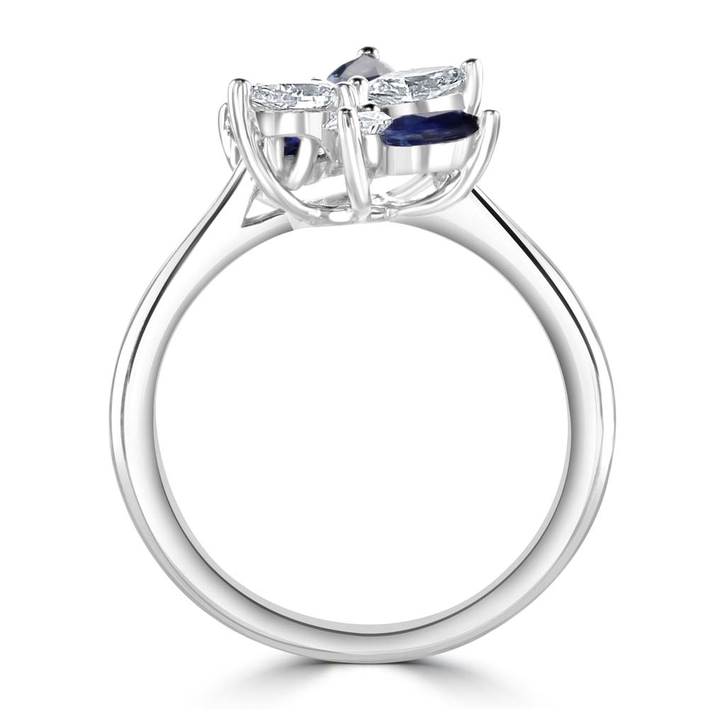 Our exquisite platinum ring has been meticulously designed to captivate and enchant. This stunning piece features a harmonious blend of precious gemstones, including 2 marquise cut sapphires, 2 marquise cut diamonds, 1 pear cut sapphire, and 1 pear cut diamond, all securely claw set to enhance their natural brilliance. The sapphires, with a total weight of 0.92ct, exude a deep, mesmerizing blue, symbolizing wisdom and royalty. Complementing them are the diamonds, totalling 0.47ct, which add a dazzling sparkle and timeless elegance to the ring. Each gemstone is carefully selected and expertly set to create a perfect balance of colour and light. Ideal for marking significant milestones or as a cherished gift for a loved one, it embodies both beauty and sentiment. The durable platinum setting ensures that this ring will be a treasured heirloom for generations to come.