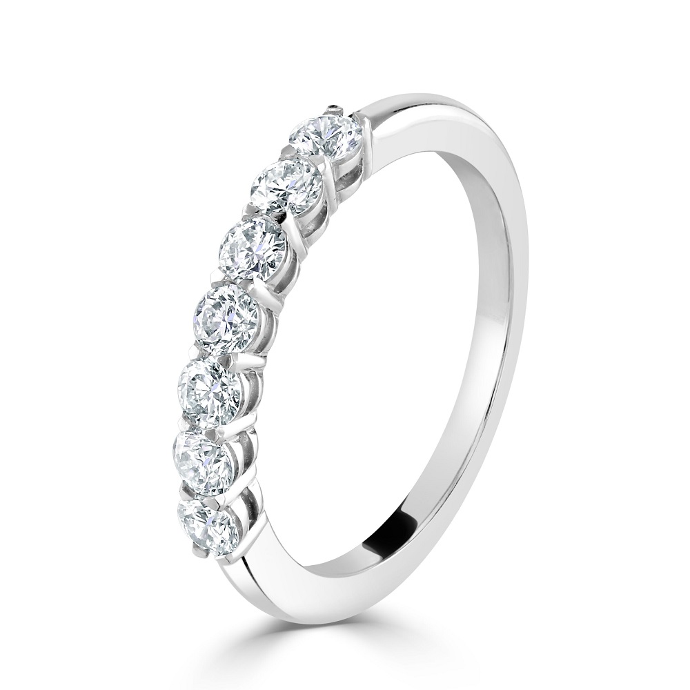 Our timeless platinum eternity ring is an exquisite symbol of everlasting love. This luxurious ring features seven round brilliant cut diamonds, each meticulously set in a four-claw setting to ensure maximum exposure and brilliance. The total diamond weight of 0.56 carats radiates exceptional sparkle and clarity, making this ring a stunning choice for celebrating life's most cherished moments. Crafted from high-quality platinum, known for its strength and durability, this ring offers both beauty and longevity. Perfect as a wedding band, anniversary gift, or a special token of affection, our platinum eternity ring is designed to be a lasting reminder of your enduring commitment and love.