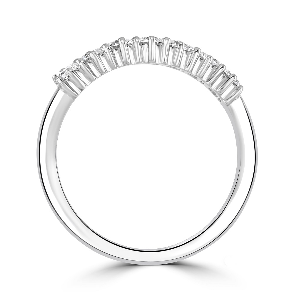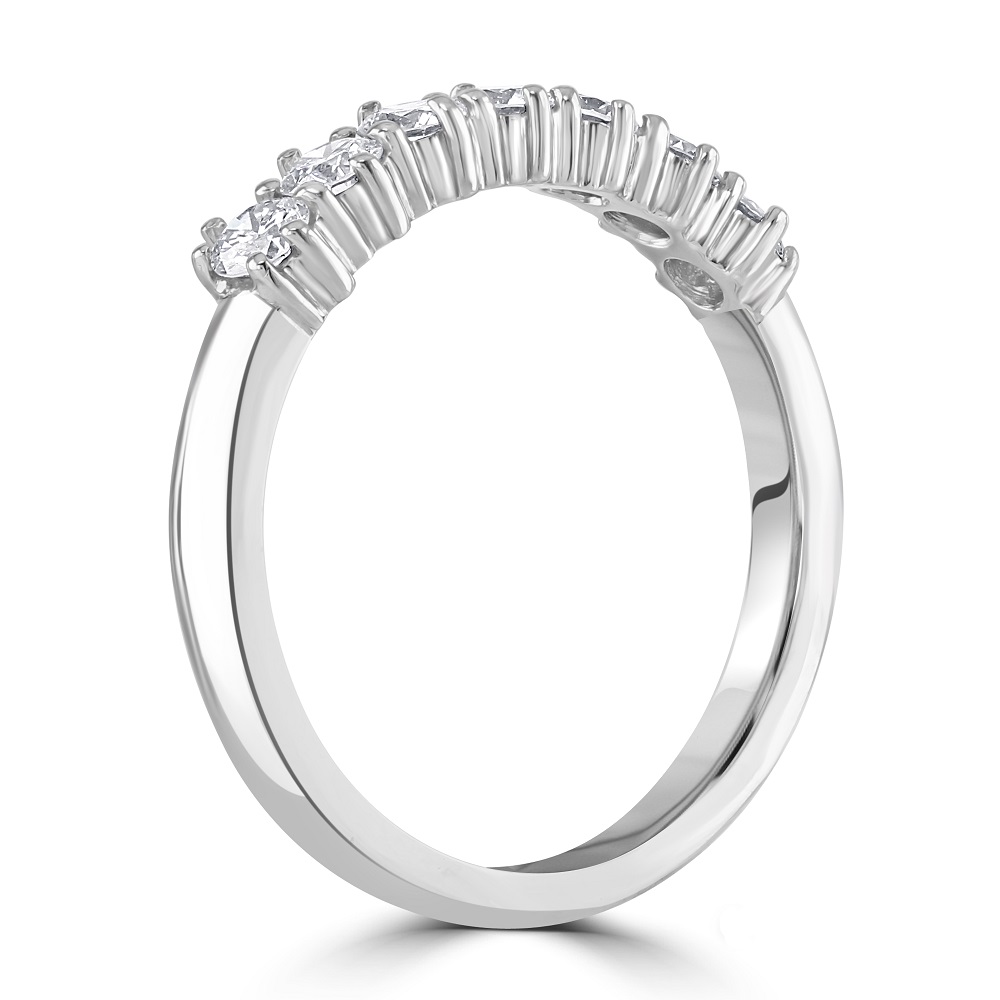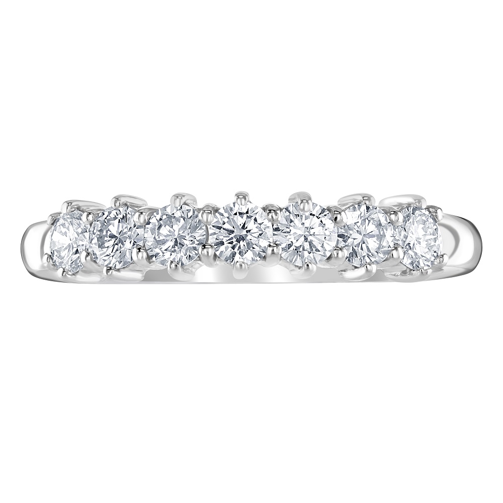 A platinum eternity ring, a symbol of everlasting love, exquisitely set with seven round brilliant-cut diamonds. Each diamond, carefully selected for its radiance, is securely held in place by six claws, enhancing both their security and aesthetic, allowing for optimal light exposure to maximize sparkle and brilliance.