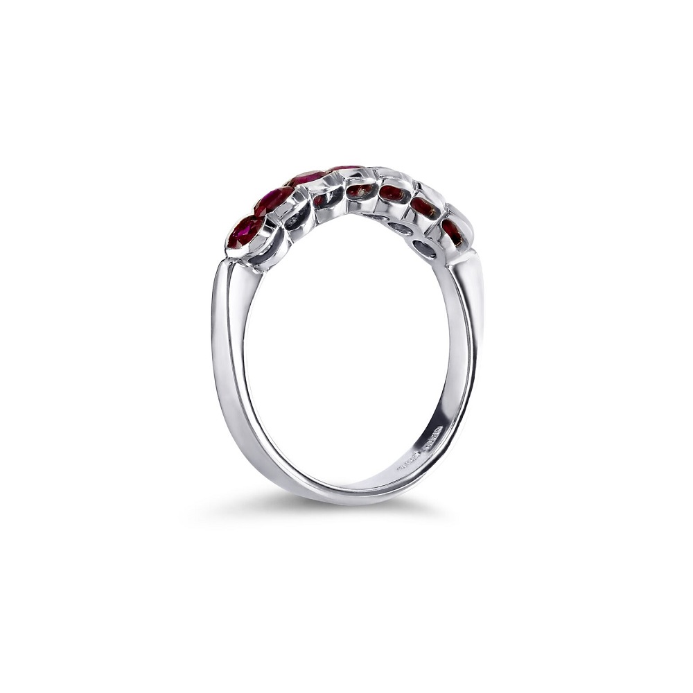 Our luxurious platinum eternity ring is expertly rubover set with seven round cut rubies, totalling an impressive 1.07 carats. Each ruby is seamlessly integrated into the platinum band, creating a smooth and elegant profile that highlights the deep, rich hues of the gemstones. This ring embodies timeless sophistication, perfect for celebrating milestones, anniversaries, or simply expressing everlasting love. Its sleek design and substantial ruby presence make it a cherished addition to any fine jewellery collection, offering enduring style and vibrant colour.