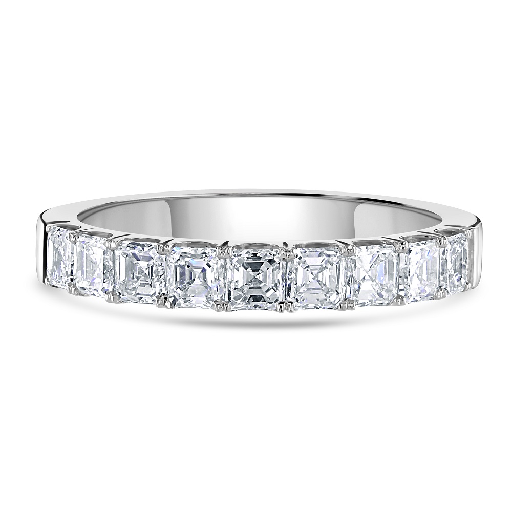 Crafted from the finest platinum, known for its durability and sleek finish, this half eternity ring offers a modern yet timeless setting that enhances the distinctive cut of the asscher diamonds. The platinum's cool sheen perfectly complements the diamonds' clarity, creating a harmonious and stunning piece that's perfect for celebrating life's most precious moments.