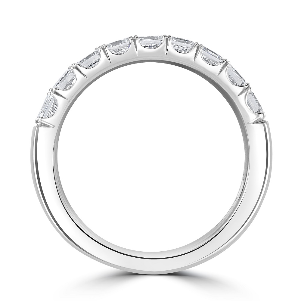 A timeless platinum half eternity ring, adorned with nine mesmerizing asscher cut diamonds, each meticulously claw set to showcase their unique geometric beauty and brilliant sparkle. With a total diamond weight of 1.08ct, these diamonds radiate unparalleled clarity and luminosity, making this ring a testament to luxury and sophistication.