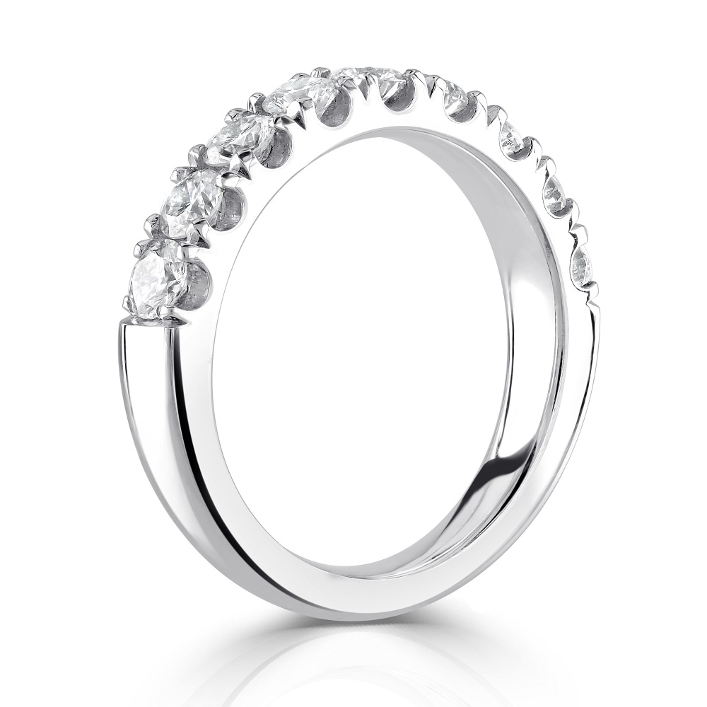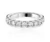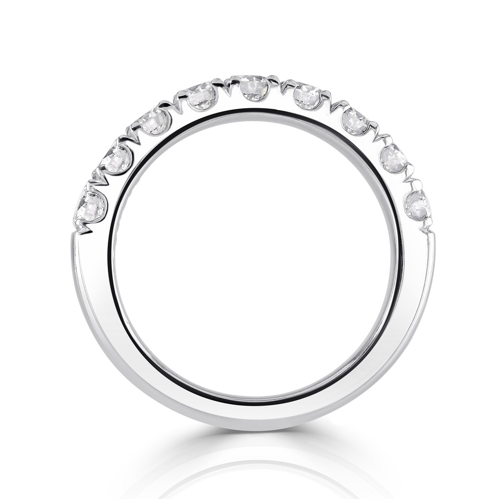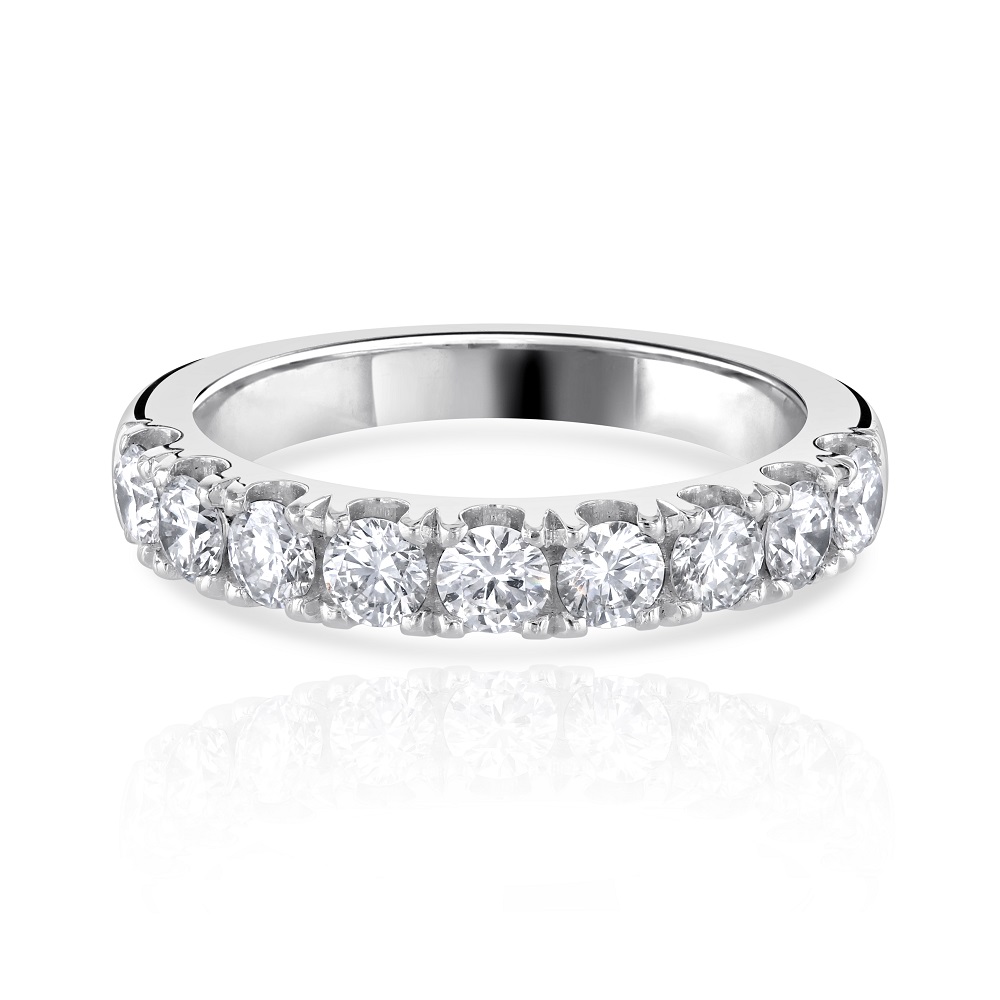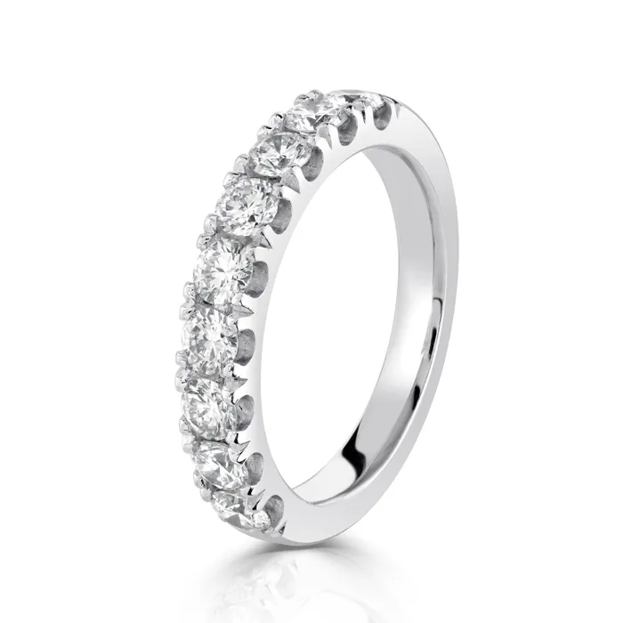 An exquisite eternity ring featuring nine castle set round brilliant cut diamonds, collectively weighing 1.11ct. Each diamond has been meticulously selected for its exceptional brilliance and clarity, ensuring a dazzling display of light and luxury. The castle setting, known for its distinctive architectural silhouette, not only secures each diamond but also enhances their visibility, allowing for an extraordinary sparkle from every angle. Crafted from premium platinum, this ring offers both durability and a sleek, sophisticated finish that complements the brilliance of the diamonds. Ideal for marking significant milestones or as a symbol of everlasting love, this half eternity ring is a testament to enduring beauty and craftsmanship.