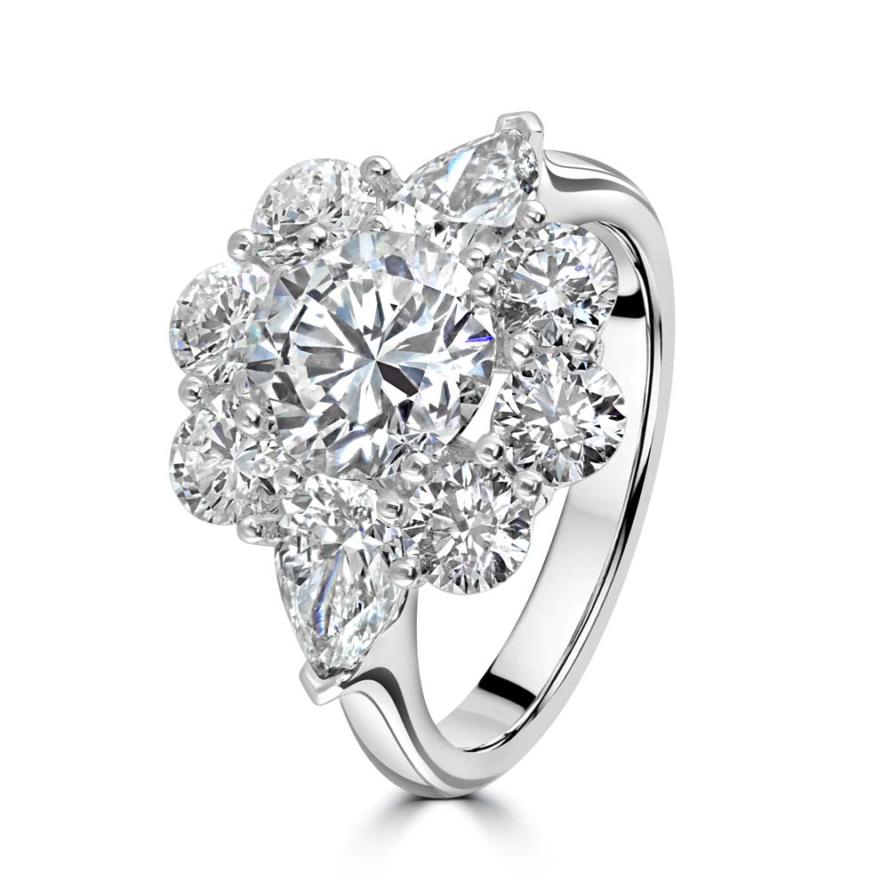 Elevate your jewellery collection with our exquisite platinum cluster ring, masterfully crafted to showcase timeless brilliance and sophistication. At its heart lies a dazzling round brilliant cut diamond, claw set to capture and reflect light from every angle. Surrounding this captivating centrepiece are six additional round brilliant cut diamonds, each meticulously claw set to form a radiant floral-inspired cluster. Enhancing the ring’s graceful silhouette, a pear cut diamond is set on each shoulder, adding a touch of refined elegance and elongating the design with their graceful taper. Crafted from premium platinum, this ring offers a luxurious and enduring setting that perfectly complements the fire and clarity of the diamonds. Ideal for those who appreciate classic beauty with a contemporary twist, this cluster ring is a stunning choice for special occasions, a meaningful gift, or a breathtaking engagement ring. Its harmonious blend of shapes and sparkle makes it a timeless treasure.