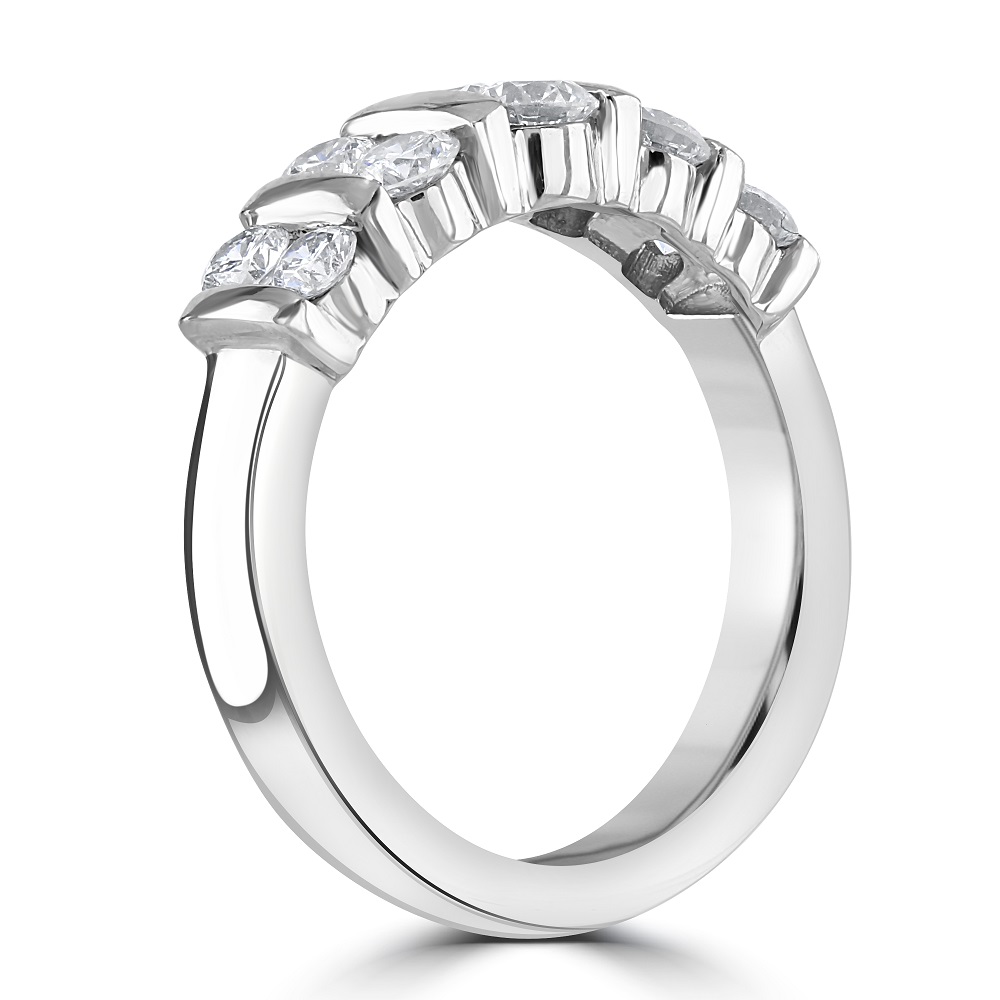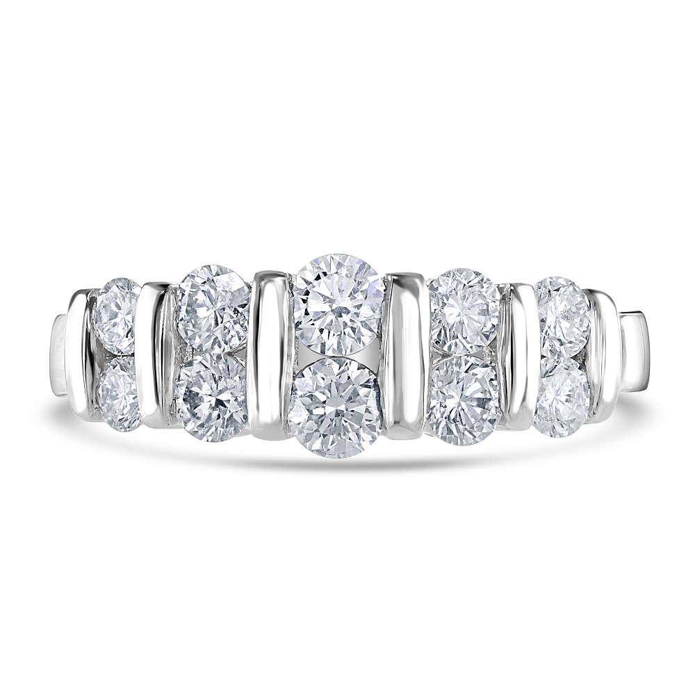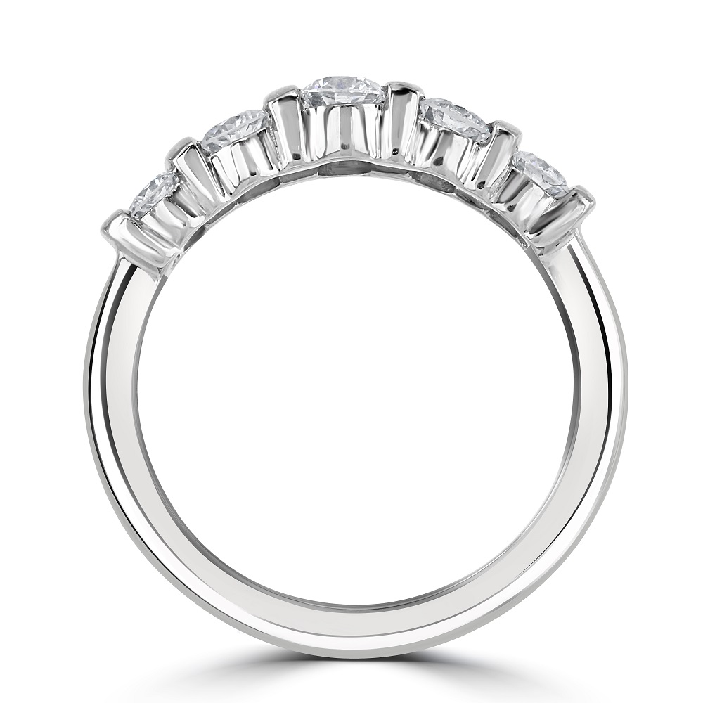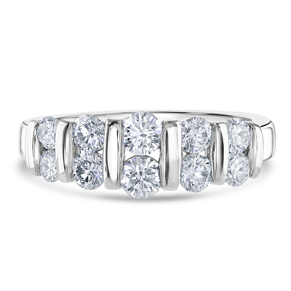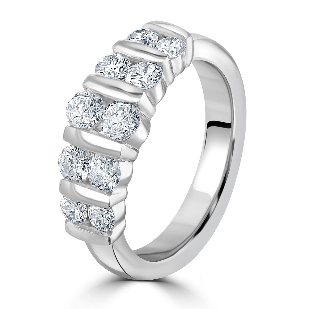 Discover the timeless elegance of our platinum half eternity ring, expertly crafted to showcase a double row of graduated round brilliant cut diamonds, totalling 1.06 carats. This luxurious ring features a unique bar setting that securely holds each diamond, enhancing their natural brilliance and creating a seamless flow of sparkle. Made from durable and prestigious platinum, this ring is designed for those who appreciate the blend of classic and contemporary styles. The graduated diamond design adds a dynamic visual appeal, making this half eternity ring a perfect choice for an anniversary gift, wedding band, or a special addition to your personal jewellery collection. Embrace this exquisite piece as a symbol of lasting love and timeless sophistication.