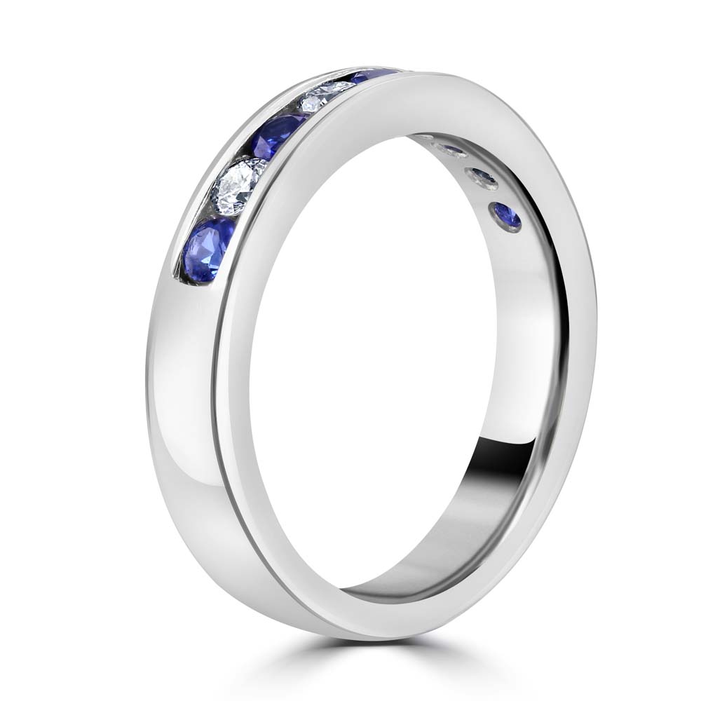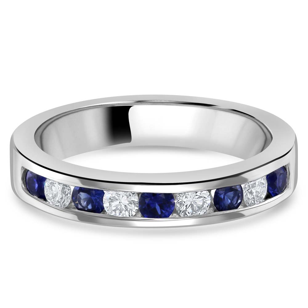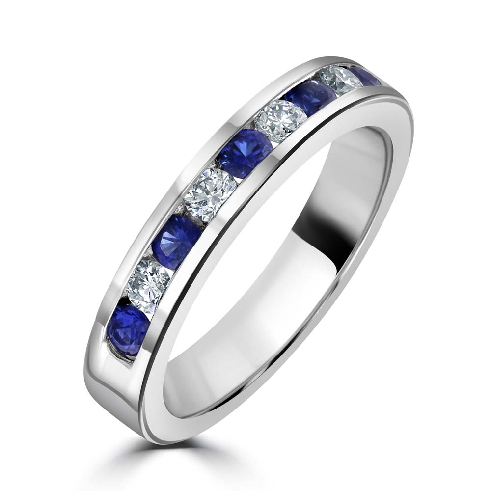 An elegant platinum half eternity ring, beautifully channel-set with a mesmerizing sequence of 5 round sapphires and 4 round brilliant-cut diamonds. This exquisite piece blends the timeless allure of sapphires with the unmatched sparkle of diamonds, offering a luxurious and sophisticated accessory for any occasion. Perfect for those who appreciate the harmony of precious gemstones set in durable platinum, this ring promises lasting beauty and style. Other sizes and variations are available, please contact the store for more information.