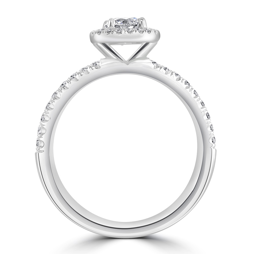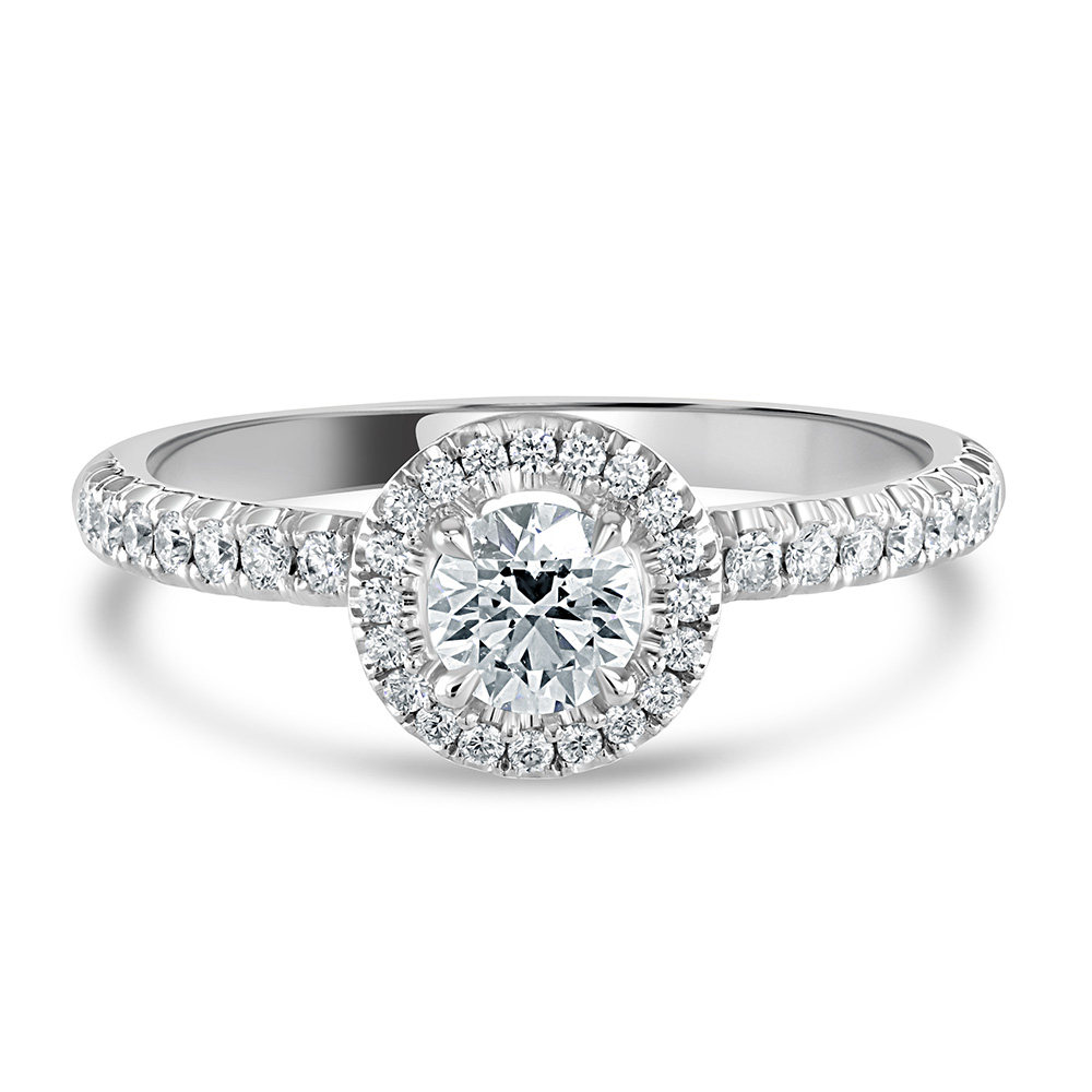 An exquisite platinum cluster ring, a beacon of luxury and sophistication. This ring features a breathtaking GIA Certified centre diamond, weighing 0.40ct, round brilliant cut and securely held by four claws. Its exceptional E colour and VS1 clarity ensure a dazzling display of light and brilliance. Encircling this central masterpiece is a halo of meticulously selected round brilliant cut diamonds, enhancing the ring's radiance and appeal.