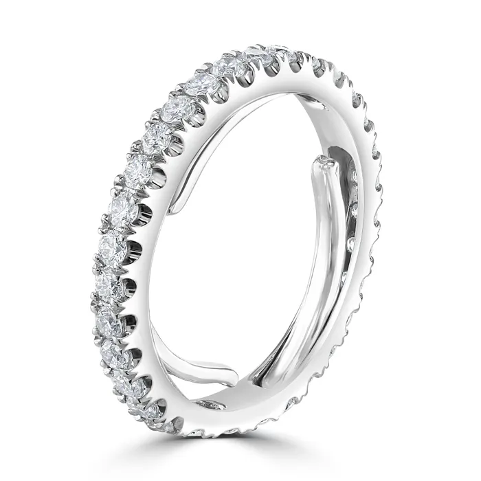 Discover our sophisticated platinum full eternity ring, an exquisite piece that represents a timeless commitment. This elegant ring is claw-set with a continuous circle of round brilliant cut diamonds, totalling 1.04 carats, ensuring that it sparkles from every angle. Each diamond is meticulously placed to showcase its brilliant clarity and perfect cut, symbolizing eternal love. Unique to this design, the ring includes three spring arms inside the band, providing enhanced comfort and a flexible fit for daily wear. Crafted from high-quality platinum, this ring offers unmatched durability and a lustrous finish that complements the dazzling array of diamonds. Ideal for an anniversary gift, wedding band, or a luxurious treat for yourself, this full eternity ring is a stunning choice for anyone seeking a piece of jewellery to cherish forever