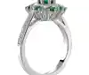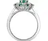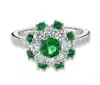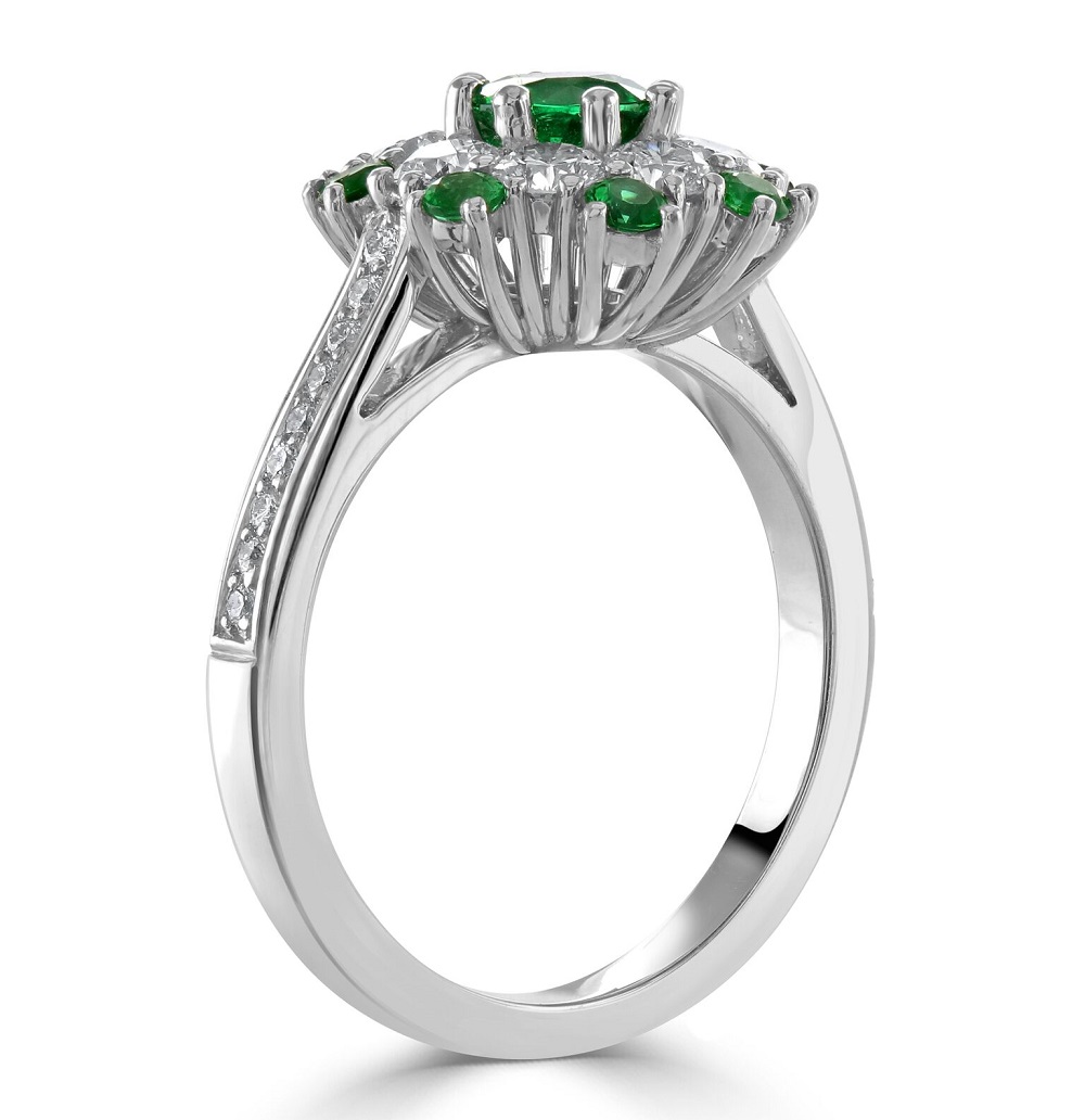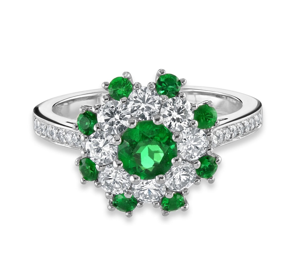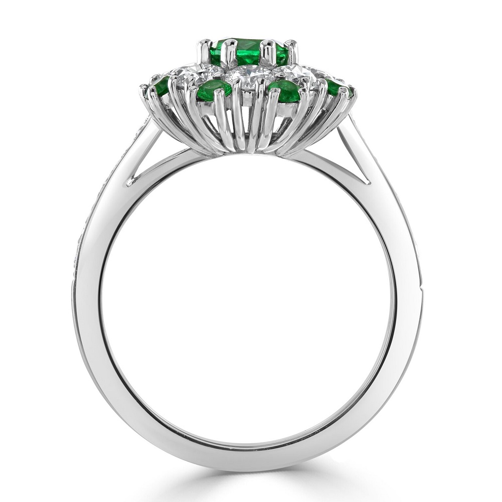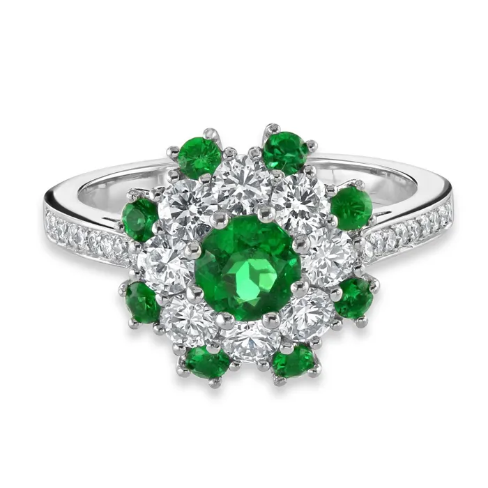 A luxurious platinum emerald and diamond cluster ring featuring a stunning centre claw-set round emerald, radiating a vibrant, deep green that symbolizes growth, renewal, and prosperity. Surrounding this central gemstone is a dazzling cluster of eight round brilliant cut diamonds, meticulously claw-set to enhance the emerald's luminous glow with their unmatched brilliance and sparkle. Encircling this radiant assembly is a further array of eight round emeralds, each claw-set to perfection, creating a mesmerizing halo that accentuates the central stone's verdant beauty. The design is completed with diamond-set shoulders, adding an extra layer of elegance and shimmer to this sophisticated piece.