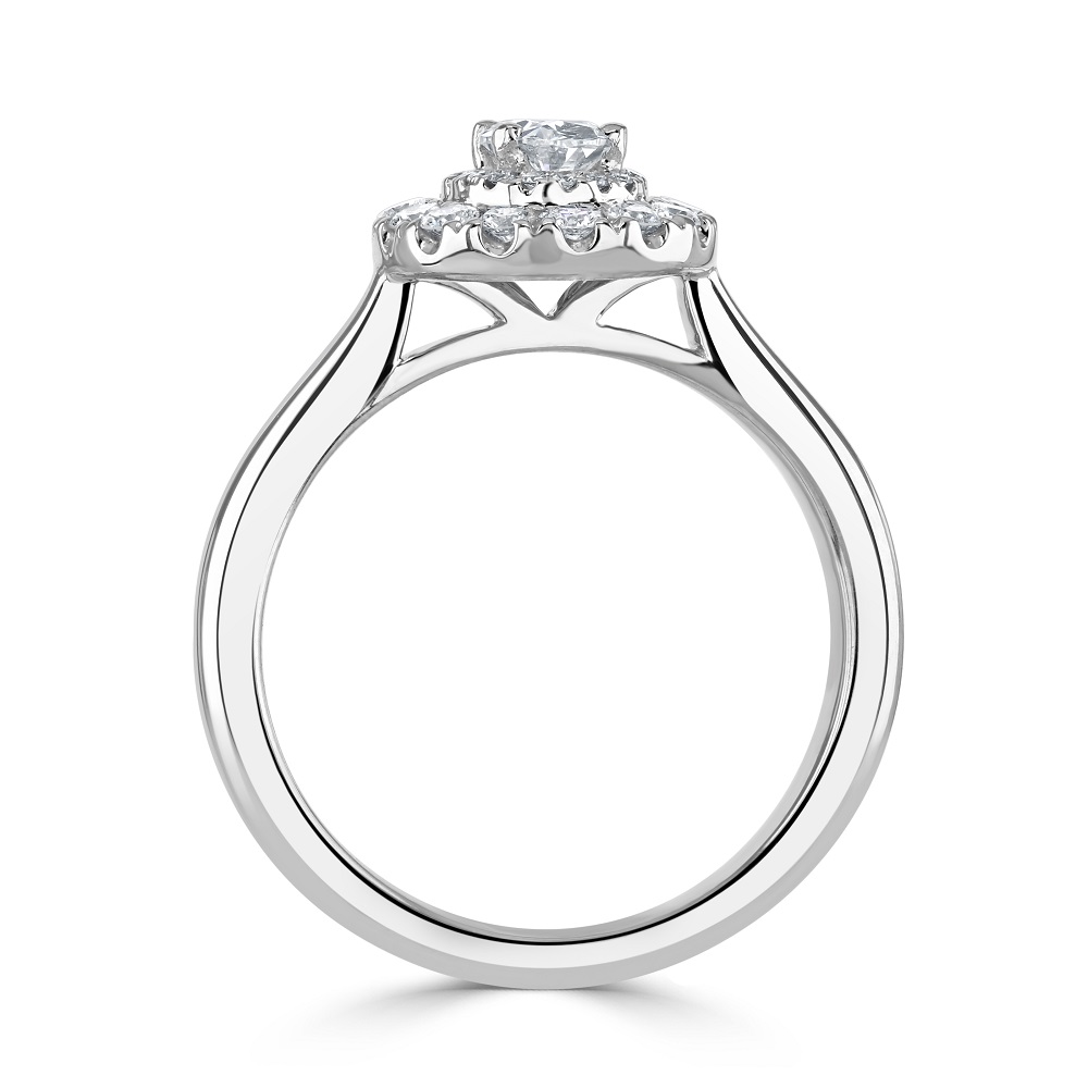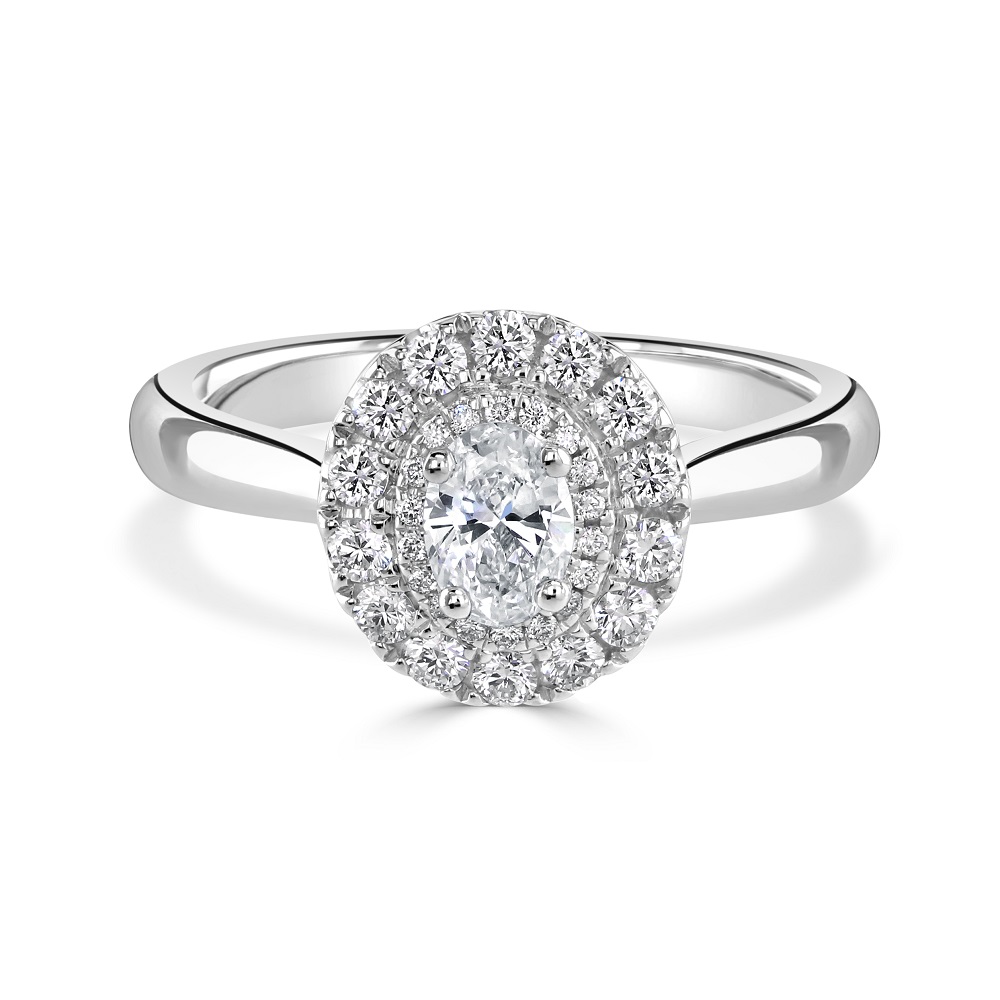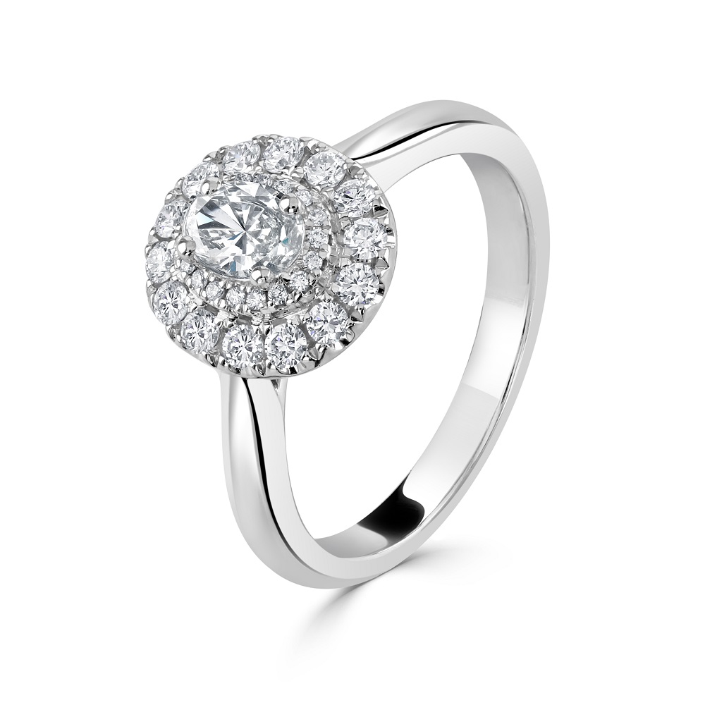 Step into the spotlight with our exquisite platinum cluster ring, a masterpiece of luxury and meticulous design. At the centre of this elegant piece sits a GIA-certified oval diamond weighing 0.36 carats, secured by a four-claw setting. This stunning diamond, noted for its E colour and VS1 clarity, radiates unmatched brilliance. Surrounding the central gem are two concentric halos composed of round brilliant cut diamonds, adding an additional 0.33 carats of sparkle. Each halo enhances the oval diamond's luminosity, creating a dazzling effect that captures attention from every angle. Crafted from premium platinum, this ring is perfect for those who seek a blend of contemporary design and timeless elegance, making it an ideal choice for engagements, special occasions, or as a significant gift.