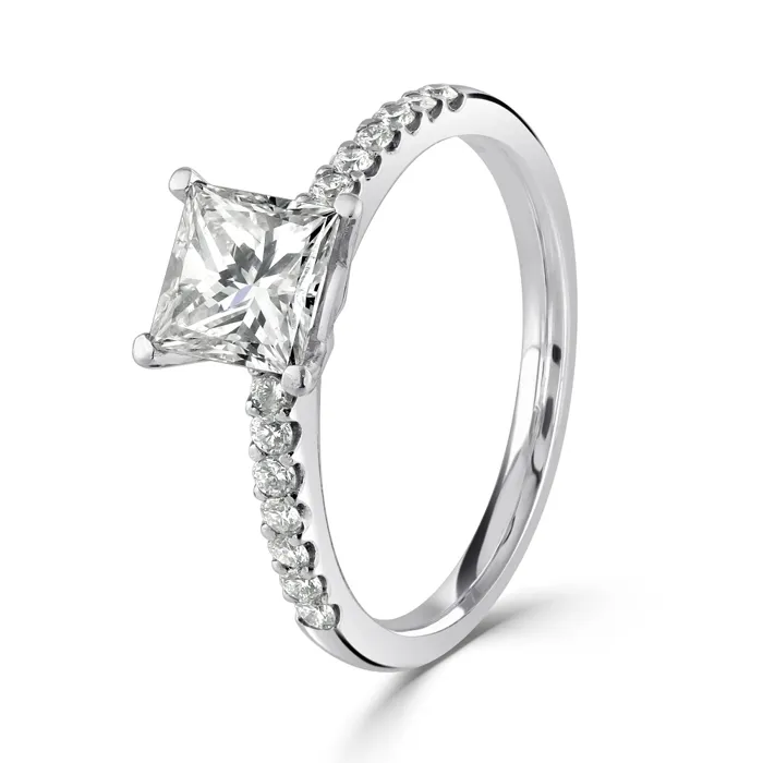 A luxurious platinum diamond ring featuring a majestic 1.05ct princess cut diamond, meticulously held in place by four sleek claws for a secure and stunning display. Adding to its brilliance, the shoulders of the ring are adorned with delicately claw-set diamonds, enhancing the sparkle and allure of the central stone.