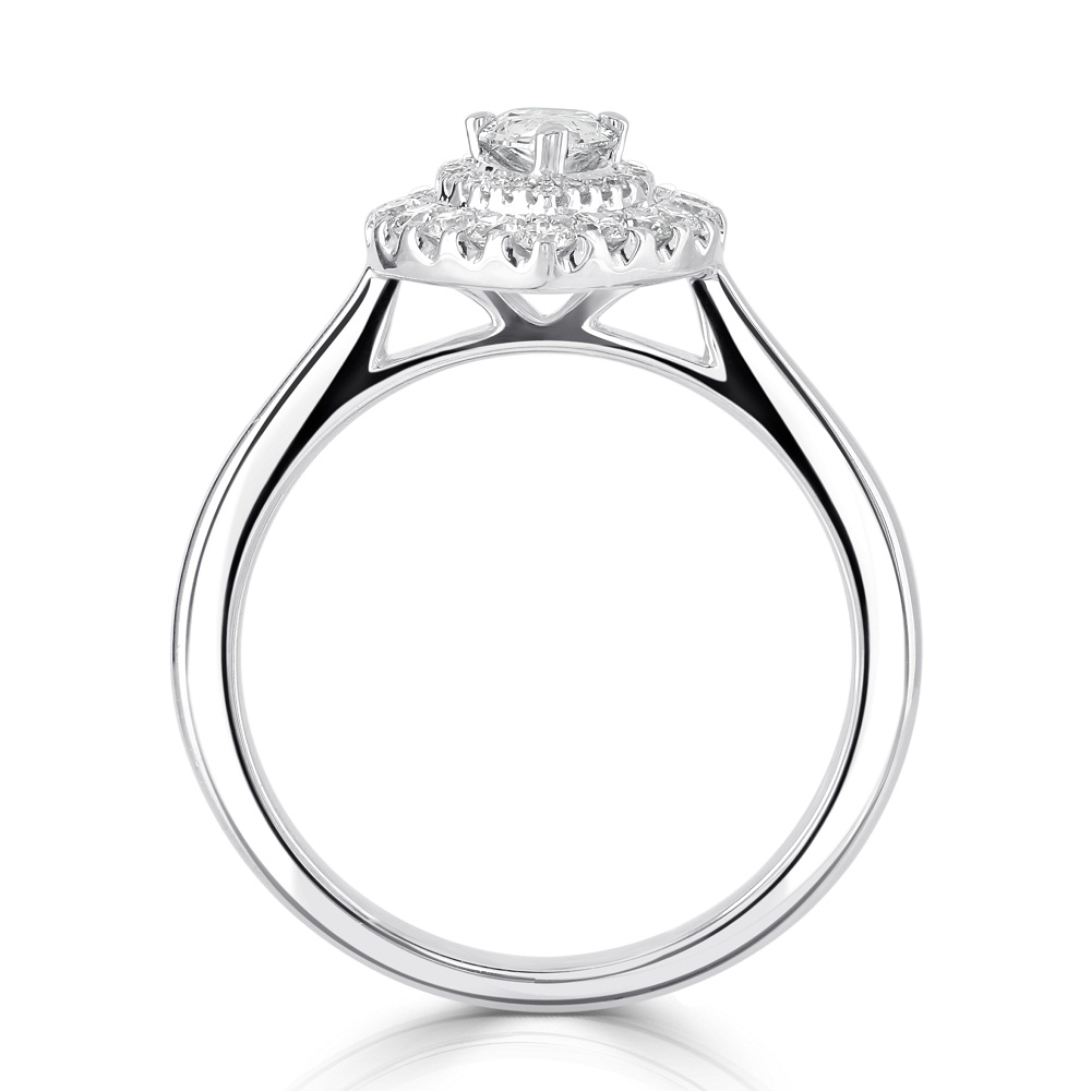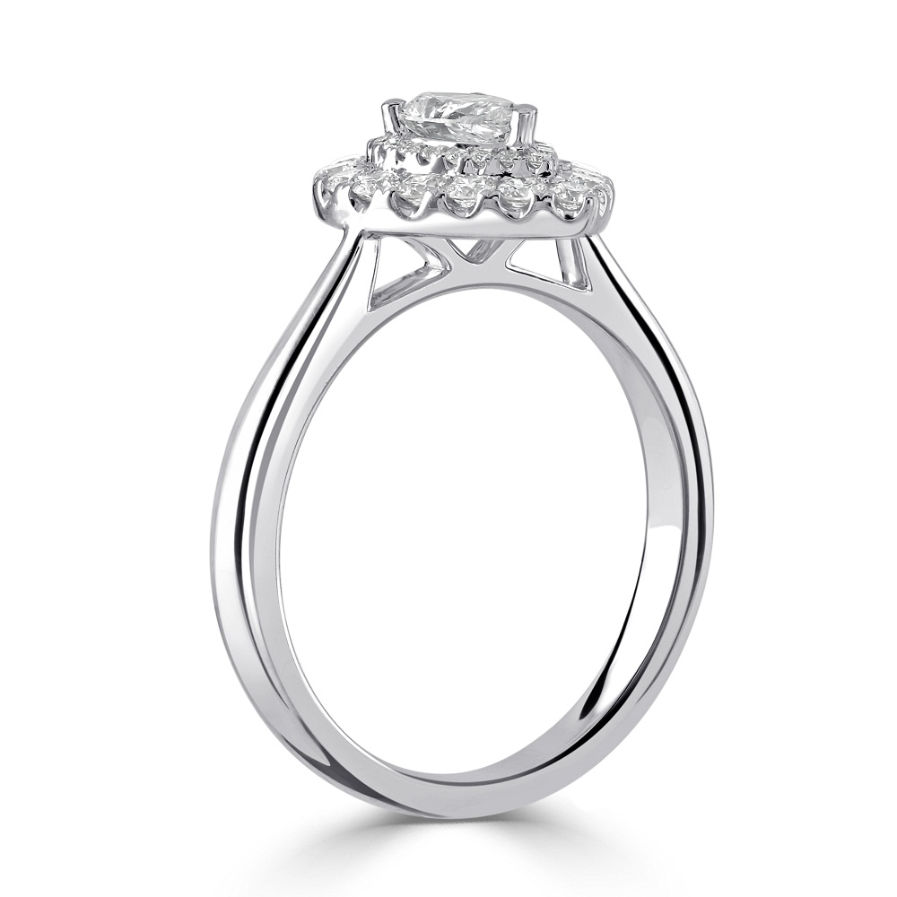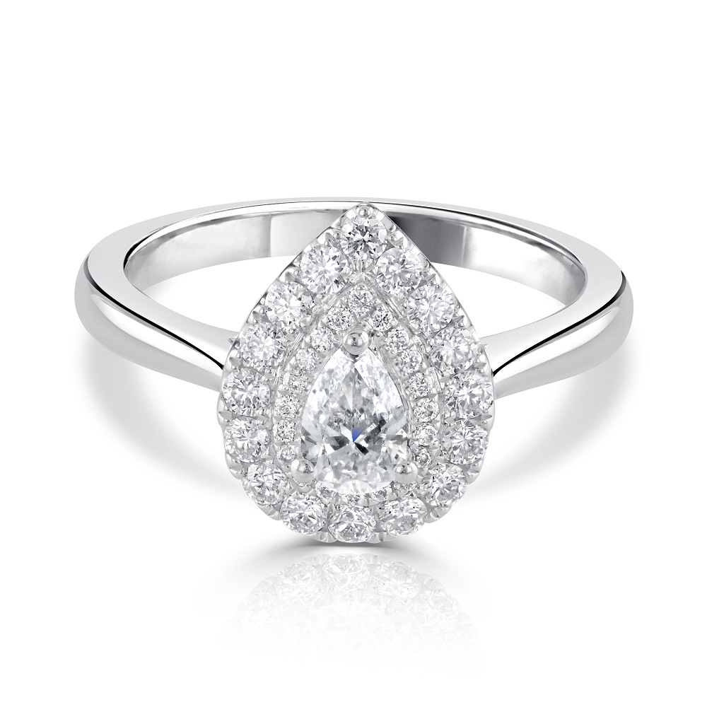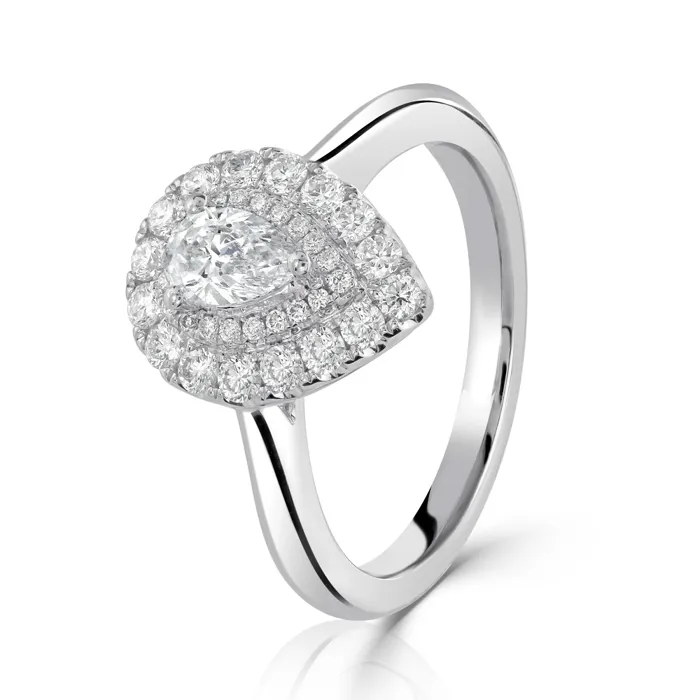Discover timeless elegance with our platinum halo ring, featuring a breathtaking GIA-certified pear-shaped diamond at its centre. This exquisite diamond, weighing 0.32 carats, is flawlessly claw-set and boasts an impeccable D colour and SI1 clarity, ensuring a crystal-clear appearance with brilliant sparkle. Encircling this stunning centrepiece are two rows of meticulously set round brilliant cut diamonds, adding an additional 0.39 carats of dazzle. The ring’s design tapers gracefully towards a sleek platinum shank, enhancing the sophisticated and refined look. Ideal for engagements, anniversaries, or as a significant gift, this halo ring is a symbol of enduring love and luxury, crafted to captivate and charm for generations.