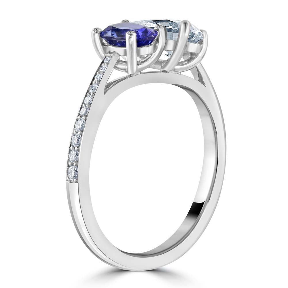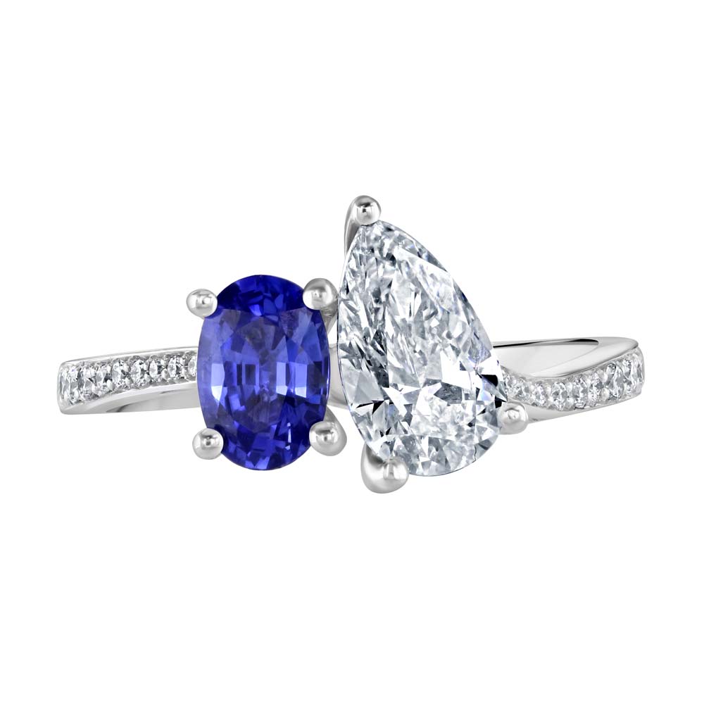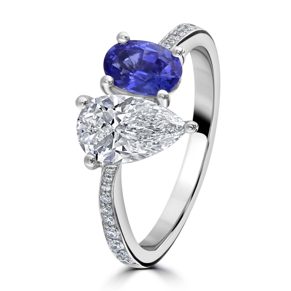 Experience our alluring platinum ring, elegantly designed with a single pear cut diamond and a single oval cut sapphire, both meticulously claw-set to showcase their exceptional beauty and brilliance. This ring is further enhanced by diamond-set shoulders that add an extra layer of sparkle and sophistication to the overall design. The central pear cut diamond weighs 1.01ct and is graded H for colour and SI1 for clarity, ensuring a dazzling white sparkle that captivates the eye. Complementing this stunning diamond is a 0.75ct oval cut sapphire, rich in deep blue hues, which beautifully contrasts with the bright luminosity of the diamond. The ring's shoulders are adorned with additional diamonds, totalling 0.14ct, which extend the sparkle along the band and amplify the ring's luxurious appeal. Crafted in durable and sleek platinum, this ring is designed to make a bold statement of elegance. Ideal for engagements, special anniversaries, or as a standout addition to any fine jewellery collection, this piece combines timeless design with exquisite craftsmanship, making it a treasure that will be cherished for generations.